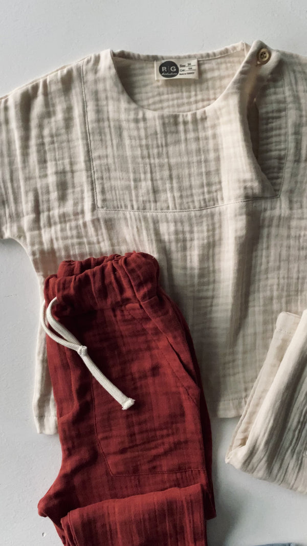 هذا الطقم المكون من قميص وبنطال مصنوع من قماش موسلين طبيعي يوفر أقصى درجات الراحة في فصل الصيف، وهو خيار مريح وأنيق لطفلك. بفضل تركيبته الخفيفة، فإنه يحافظ على البرودة، ويكمل أناقة المظهر في الاستخدام اليومي أو في المناسبات الخاصة بفضل تصميمه الأنيق.