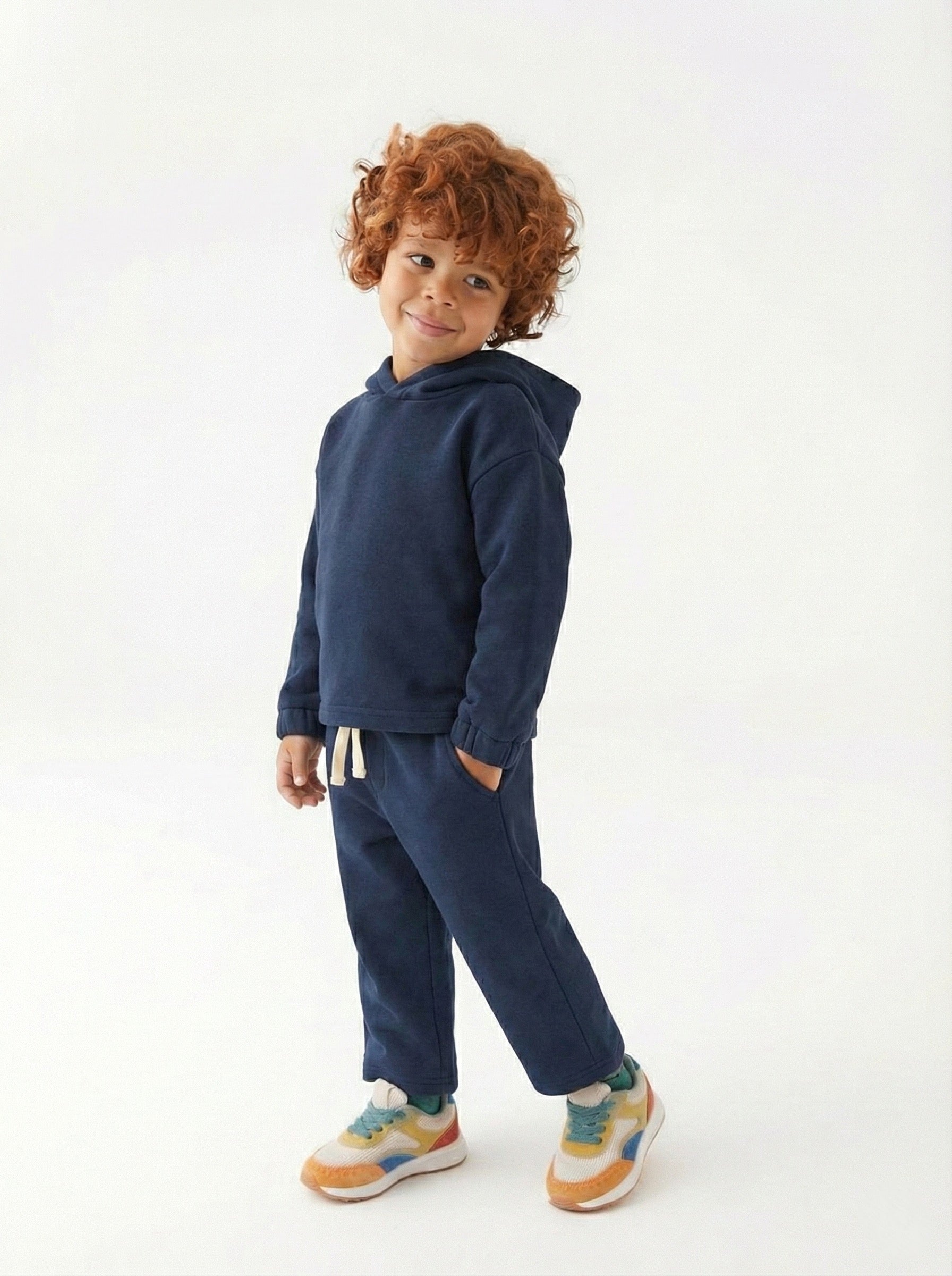 Günlük kullanım için tasarlanan unisex 2’li bebek eşofman takımı, kapüşonlu sweat ve lastikli, ipli bel eşofman altından oluşur. Orta kalınlıkta, yumuşak dokulu %100 pamuklu 3 iplik şardonsuz kumaşı sayesinde bebeğinizin hassas cildine dosttur, gün boyu rahatlık ve hareket özgürlüğü sağlar.