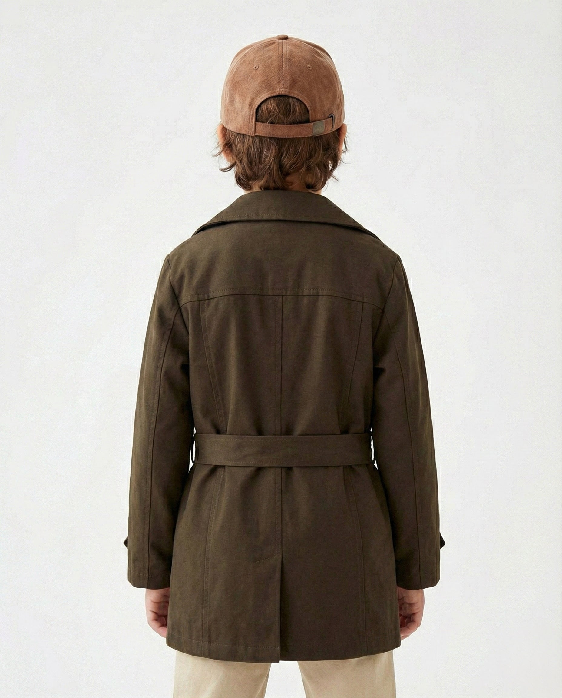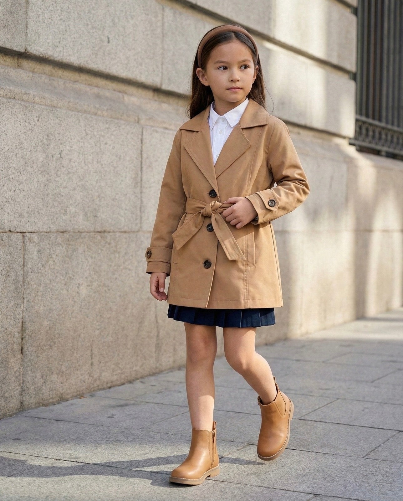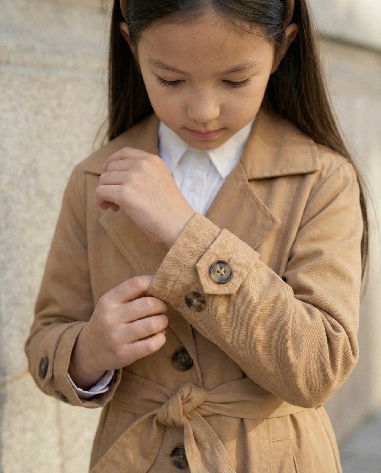 - Verstellbare Taille:Durch das Bindedetail an der Taille sitzt der Trenchcoat besser am Körper und verleiht Ihrem Kind eine stilvolle Silhouette.
