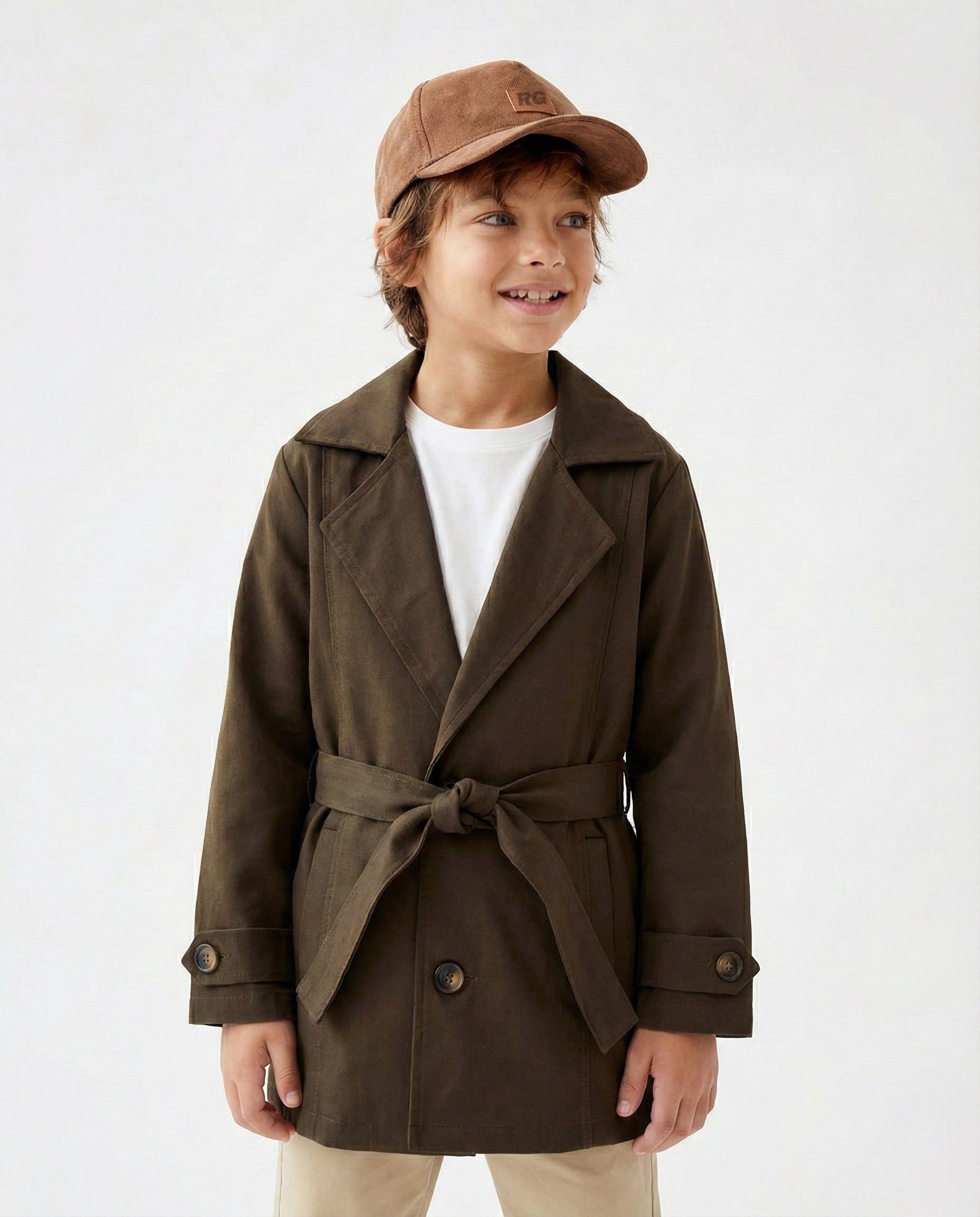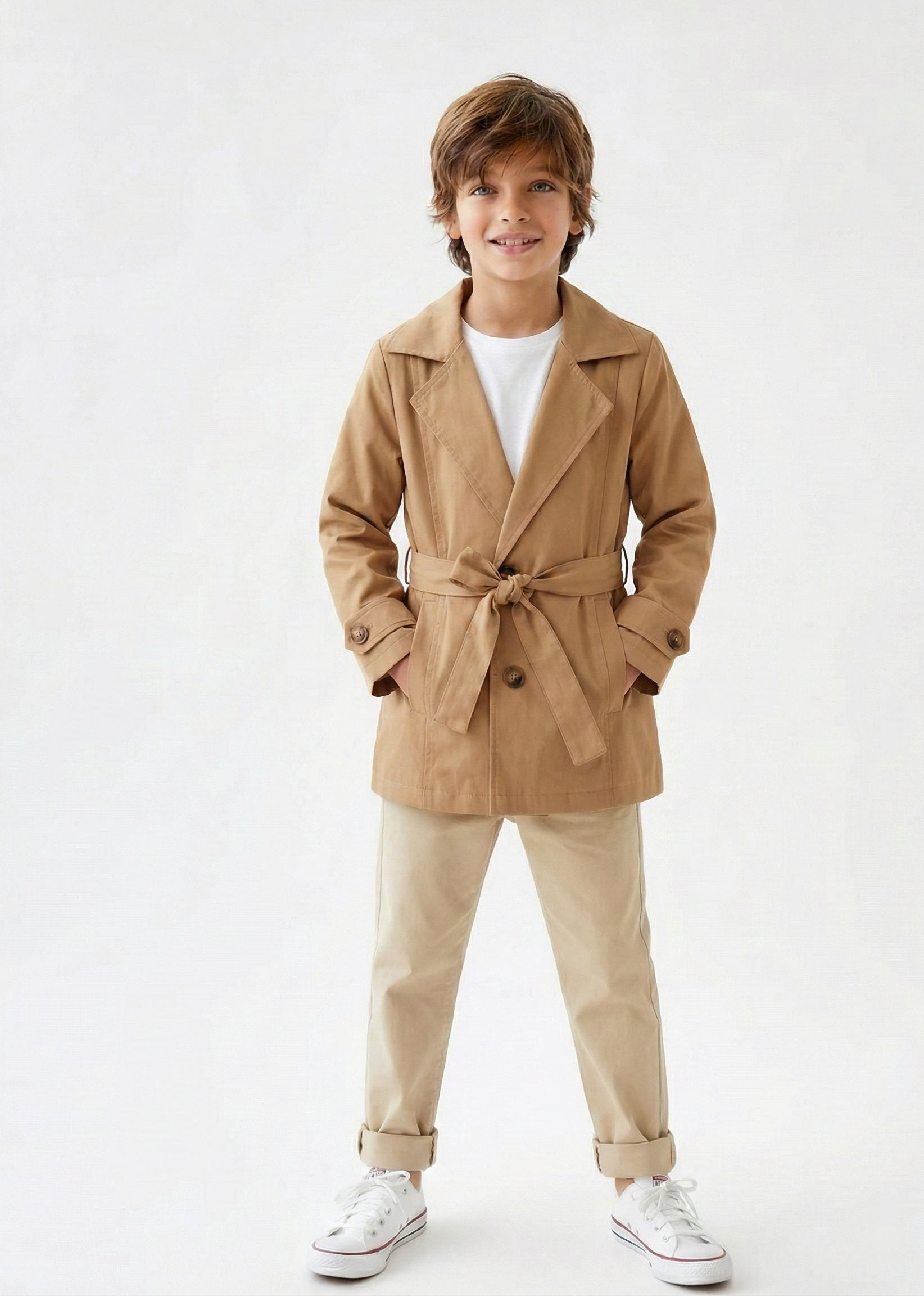 Der speziell für Kinder entworfene Trenchcoat mit Knöpfen vorne und Bindedetail vereint Eleganz und Komfort. Dieser aus hochwertigen Materialien gefertigte Trenchcoat wird während der saisonalen Übergänge ein unverzichtbares Kleidungsstück in der Garderobe Ihres Kindes sein. Dieser Trenchcoat besticht durch sein modernes Design und seine Funktionalität und macht ihn in jeder Umgebung zu einem Hingucker.