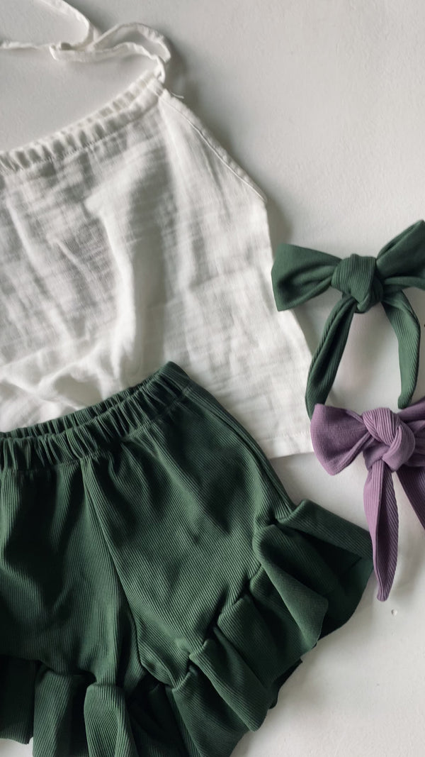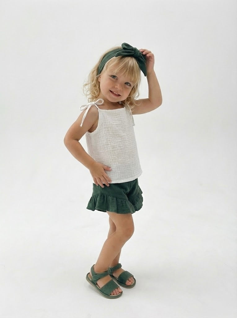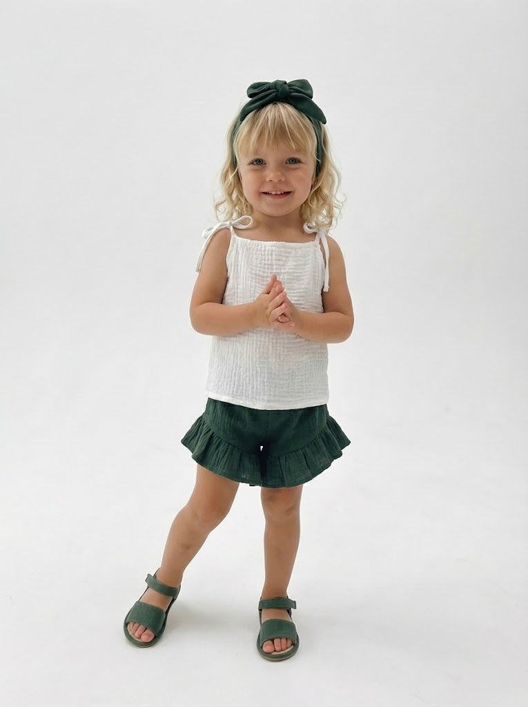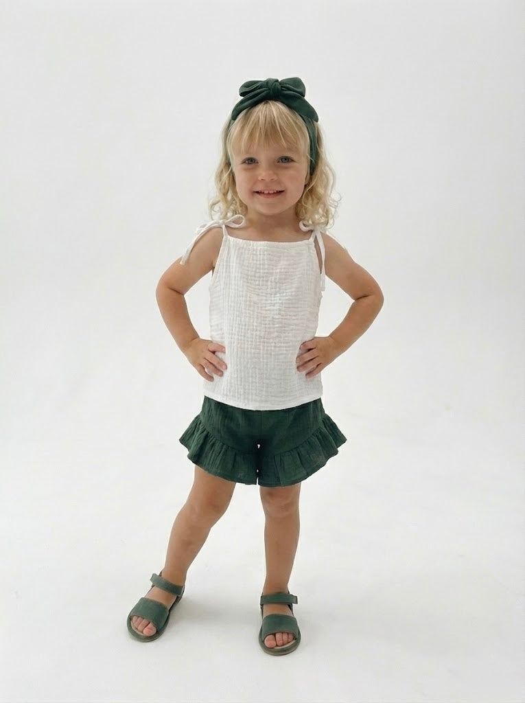 Dieses 3er-Set, speziell für Mädchen,Es wird für die Sommermonate unverzichtbar sein.Set bestehend aus einem Baumwoll-Musselin-Top, einer Bluse, einem Stirnband und gerippten Baumwoll-Shorts.Es ermöglicht eine komfortable Anwendung, ohne die Haut Ihres Kindes zu reizen.Abgerundet wird das Set durch das dazugehörige Haarband.Es ist sowohl stilvoll als auch nützlich.