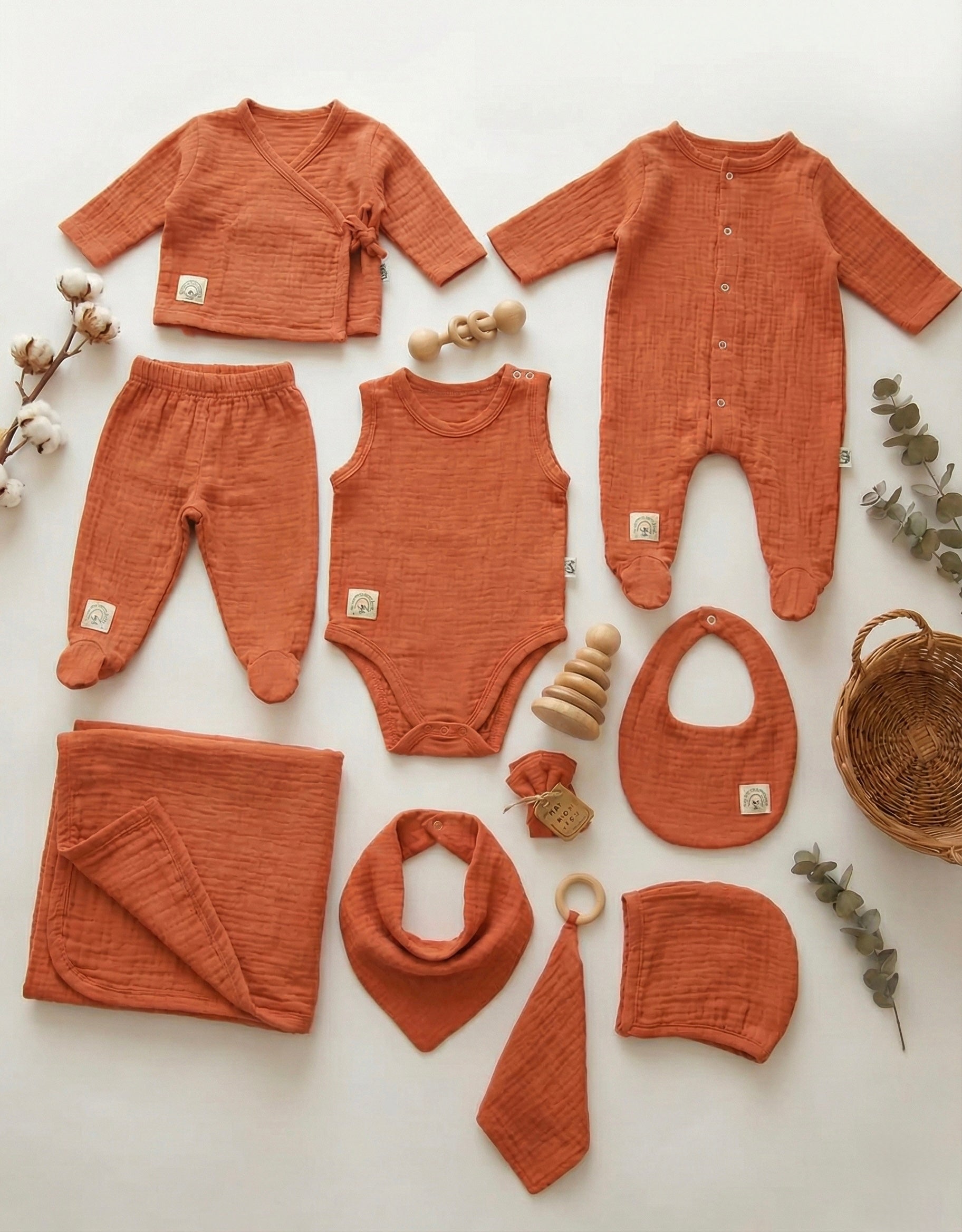 Dieses 10-teilige Babyset ist speziell für Neugeborene konzipiert und besteht aus Musselinstoff. Dieses Set, das sich durch seine natürliche und weiche Textur auszeichnet, wurde im Hinblick auf den Komfort und die Gesundheit Ihres Babys zusammengestellt.