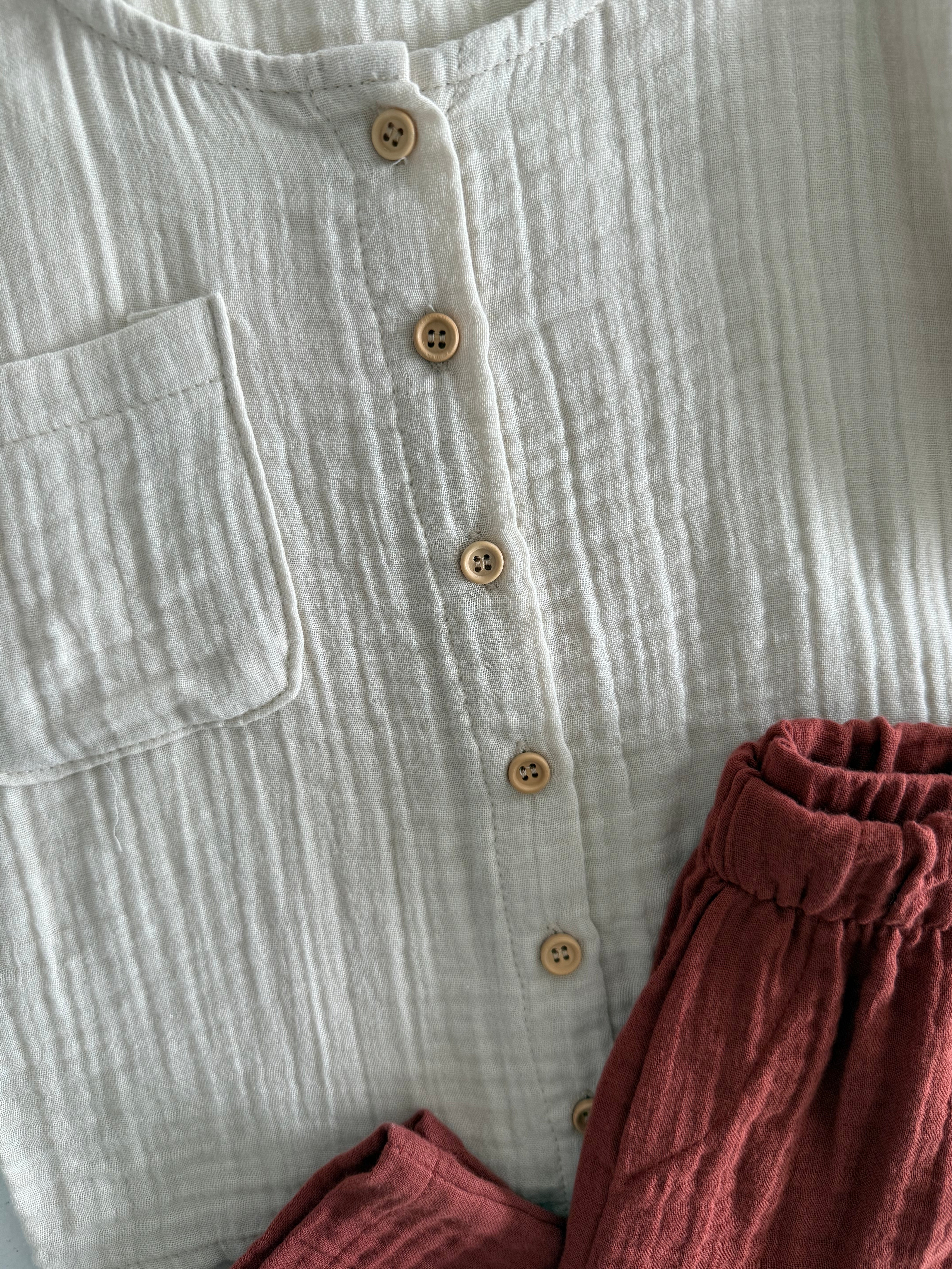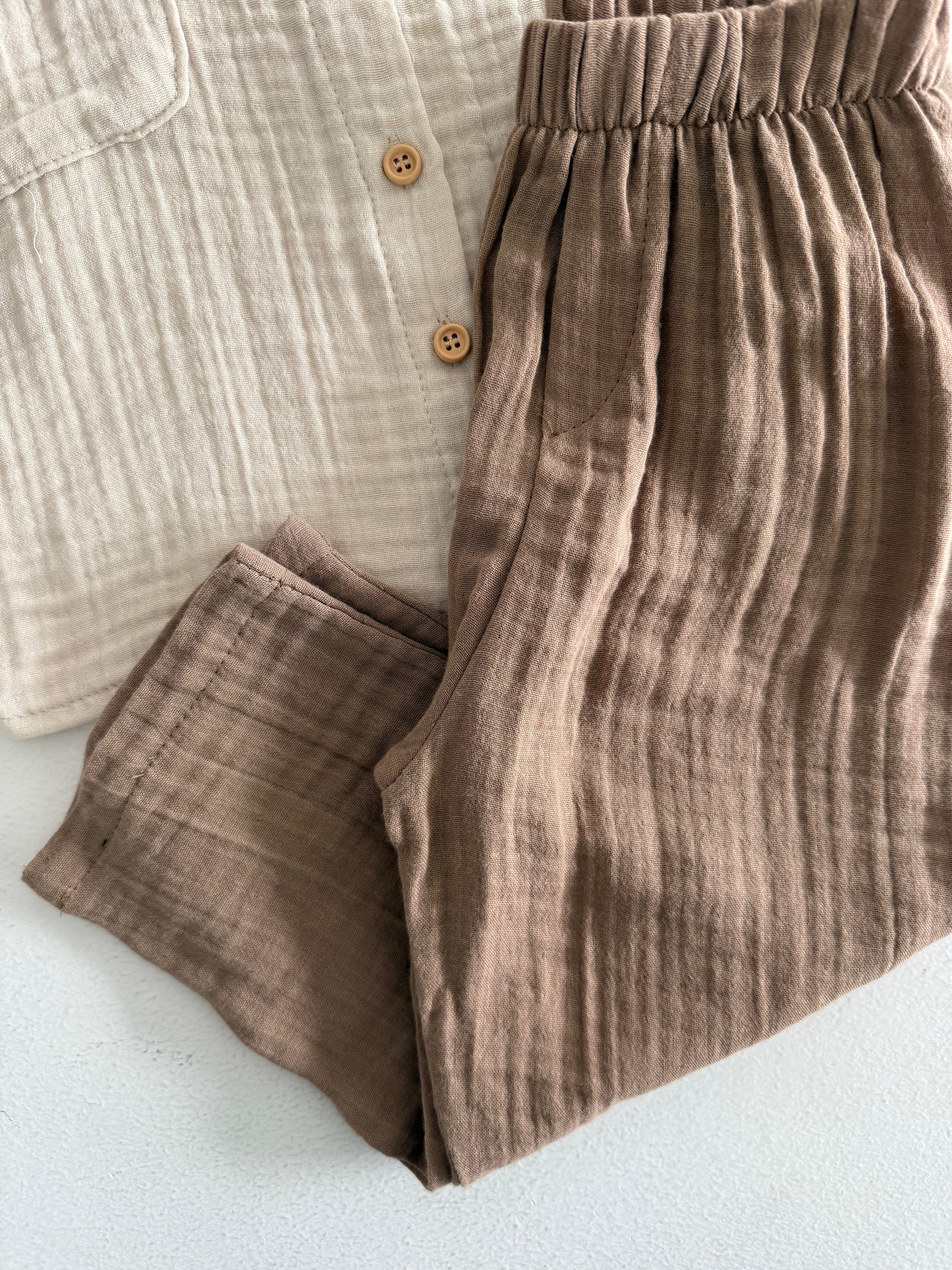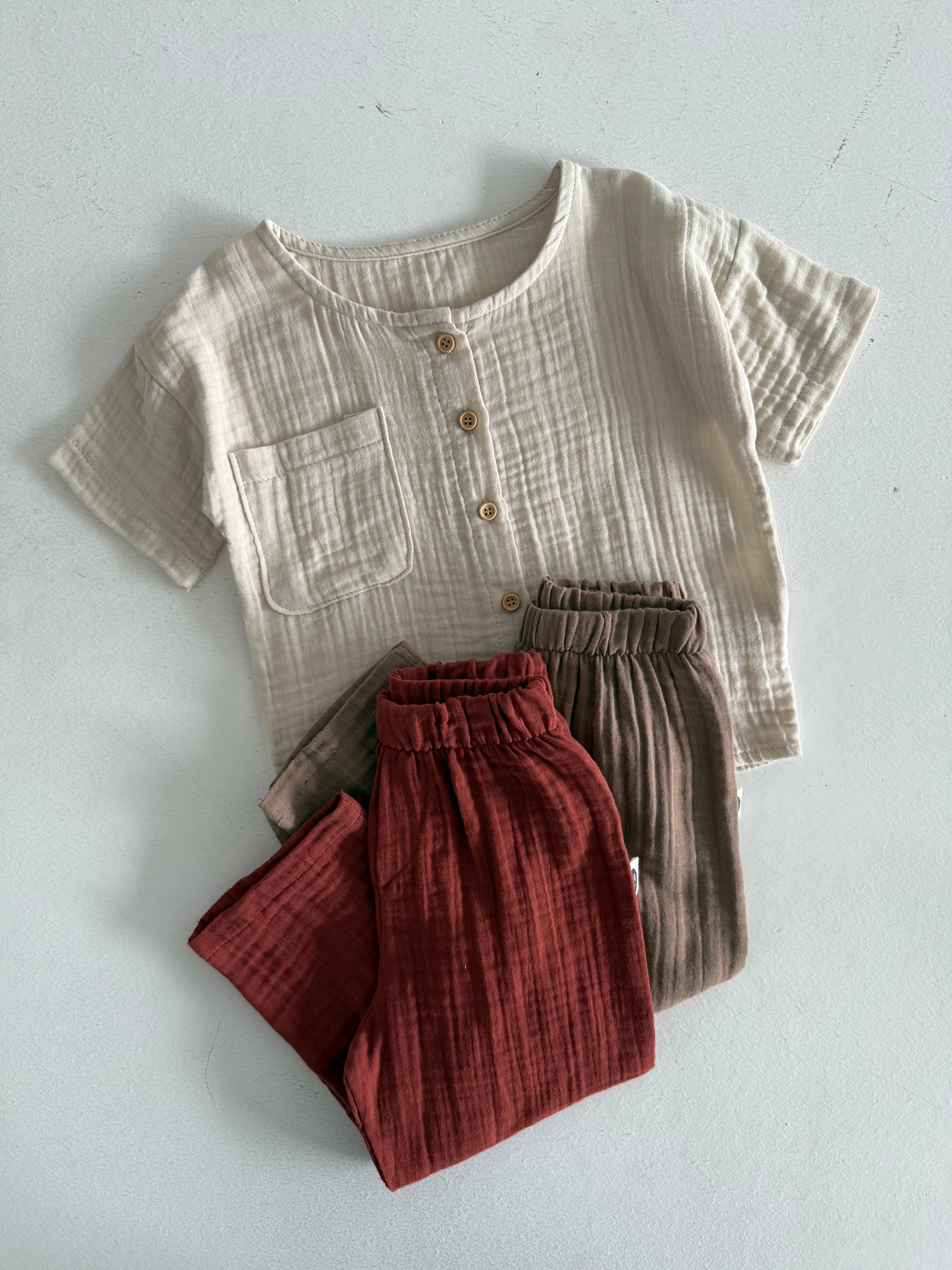 RG Brand's 100% cotton muslin baby set is designed for both girls and boys. The natural and breathable muslin fabric offers excellent comfort for sensitive baby skin. Suitable for newborns to 2 years old, the set boasts a minimalist, timeless design. It combines comfort, style, and functionality for everyday use.