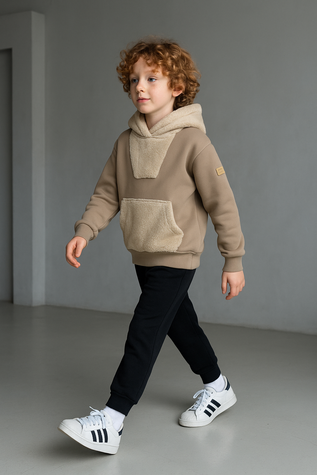 This children's hooded sweatshirt adds comfort and elegance to your child's daily clothing by prioritizing comfort and practicality. It offers a useful option with its kangaroo pocket design, while its hooded structure provides extra protection in cold weather.