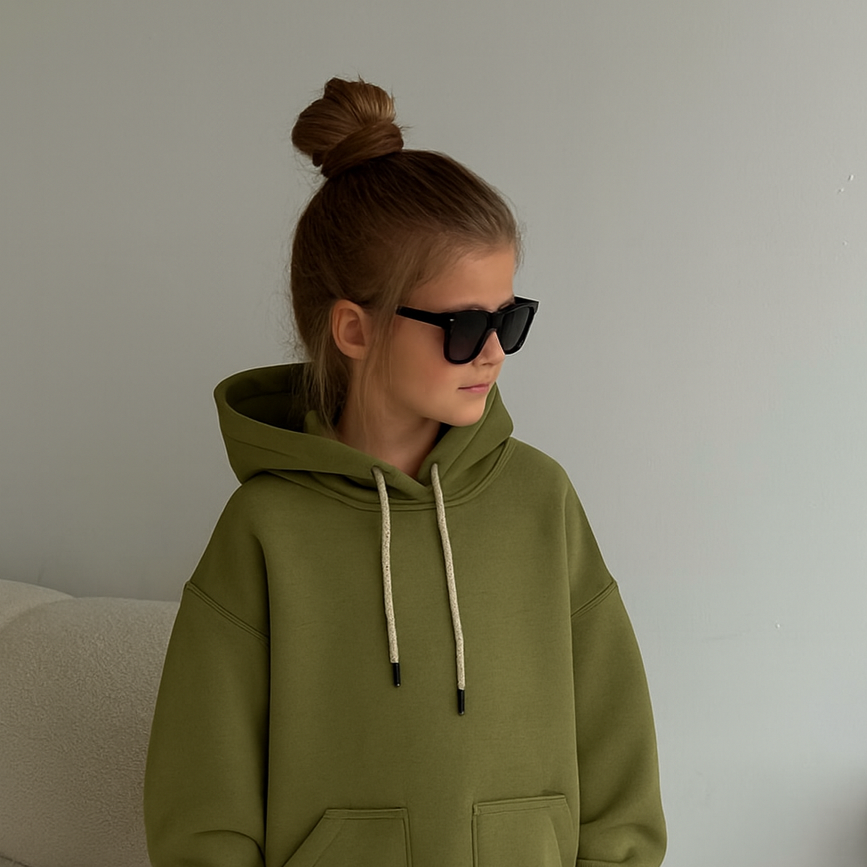 The Hooded and Pocketed Girls Sweat Dress is a perfect option designed with both comfort and elegance in mind for your child. It is ideal for daily use with its soft and comfortable fabric, and it also attracts attention with its modern design.