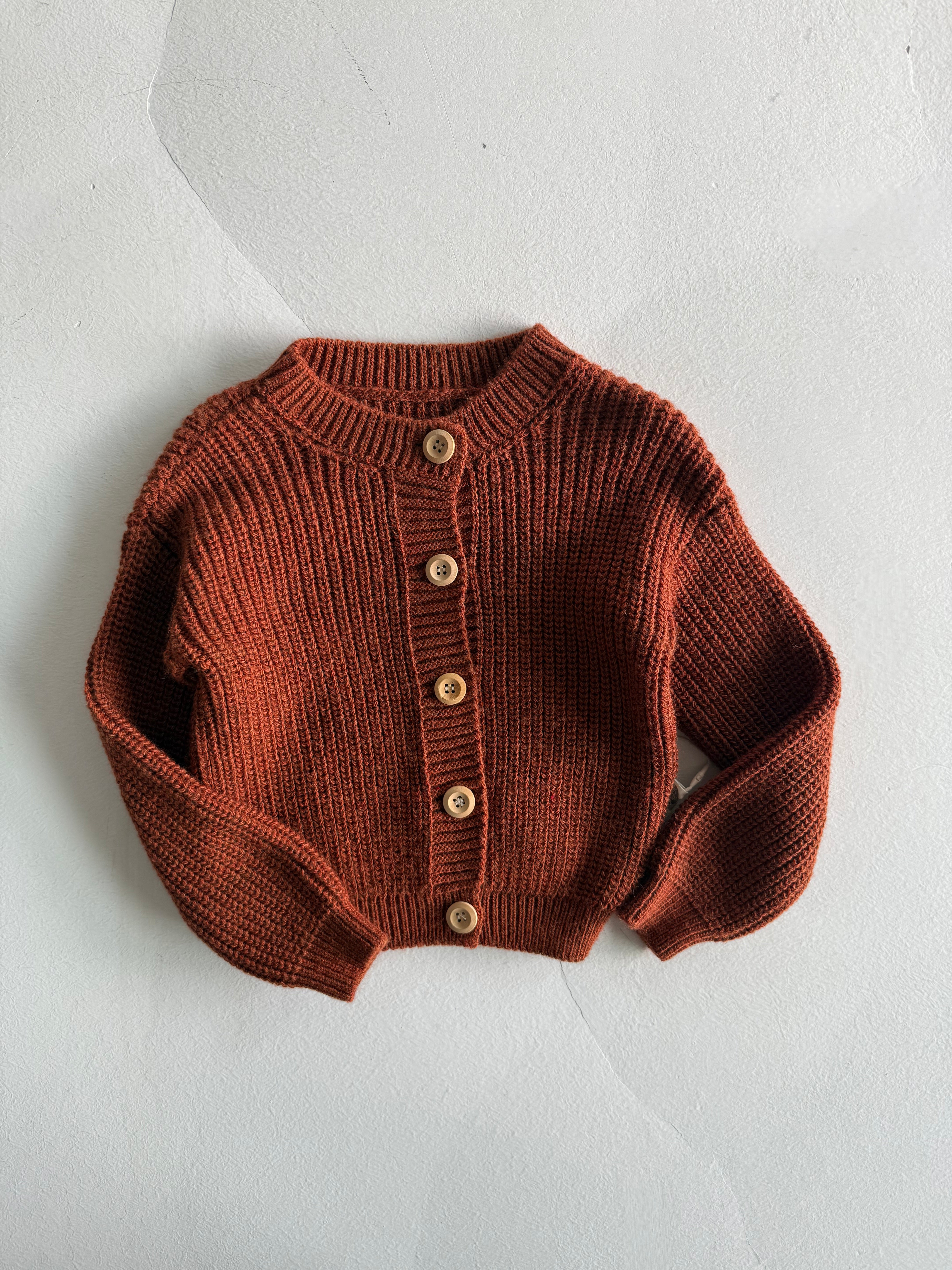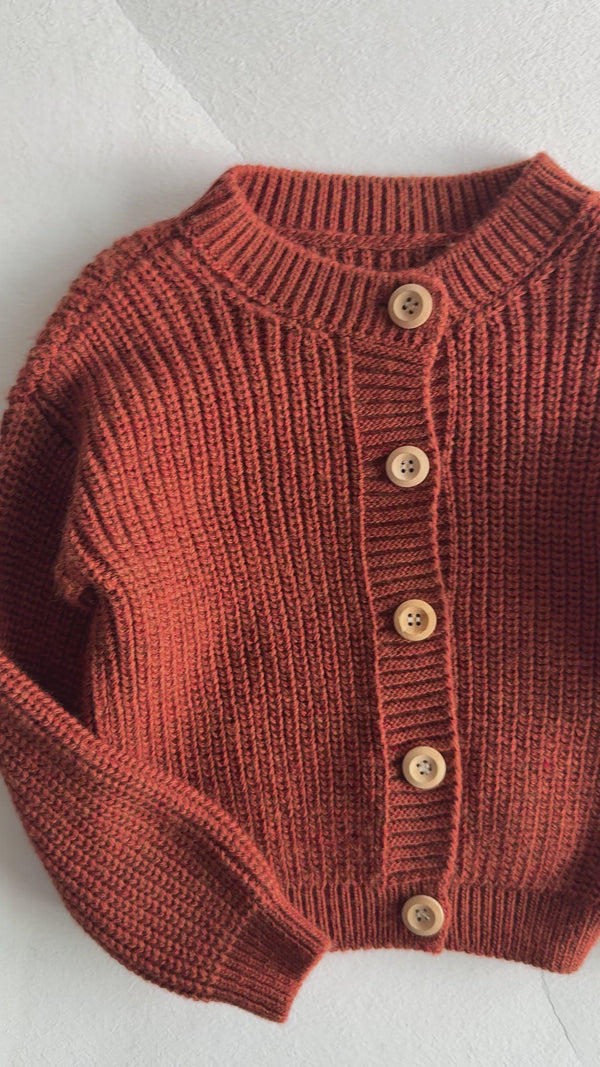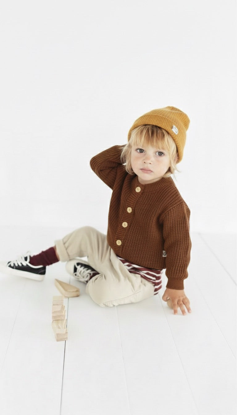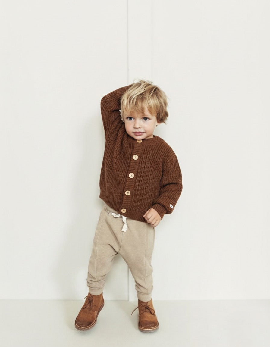 This crew neck cardigan stands out with its simple yet stylish design. Its earthy tone easily pairs well with a variety of outfits. Its loose cut allows your baby freedom of movement while also creating a stylish look. It's perfect for both everyday wear and special occasions.