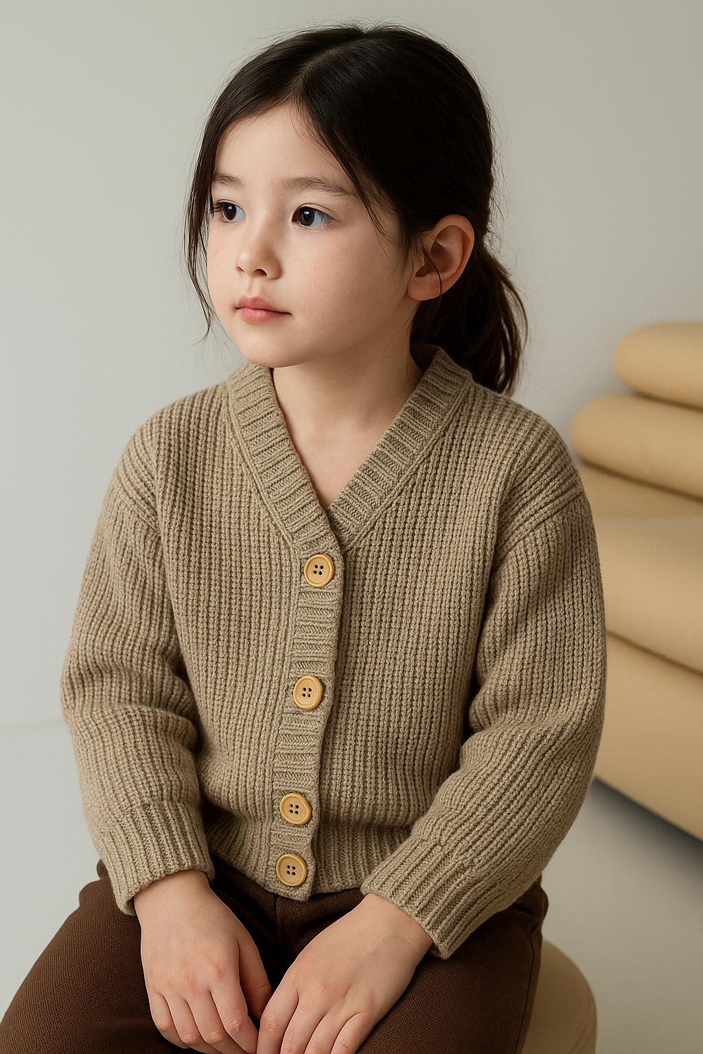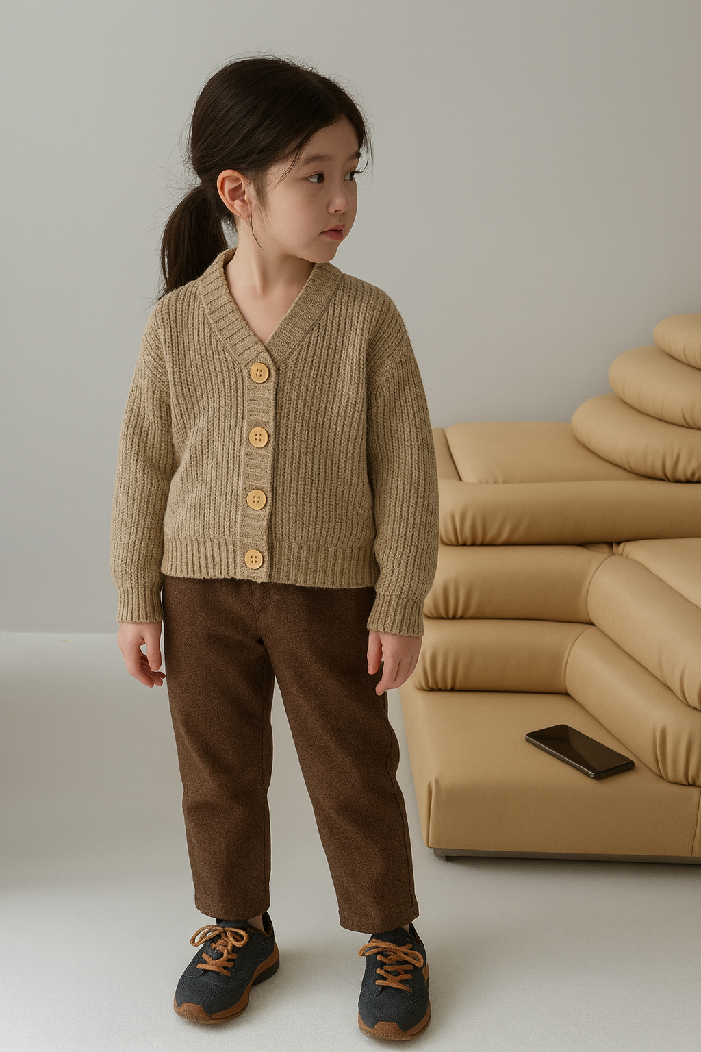 This V-neck knit cardigan stands out with its simple yet stylish design. Its beige color makes it easy to pair with a variety of outfits. Its loose cut allows your child freedom of movement while also creating a stylish look. It's perfect for both everyday wear and special occasions.