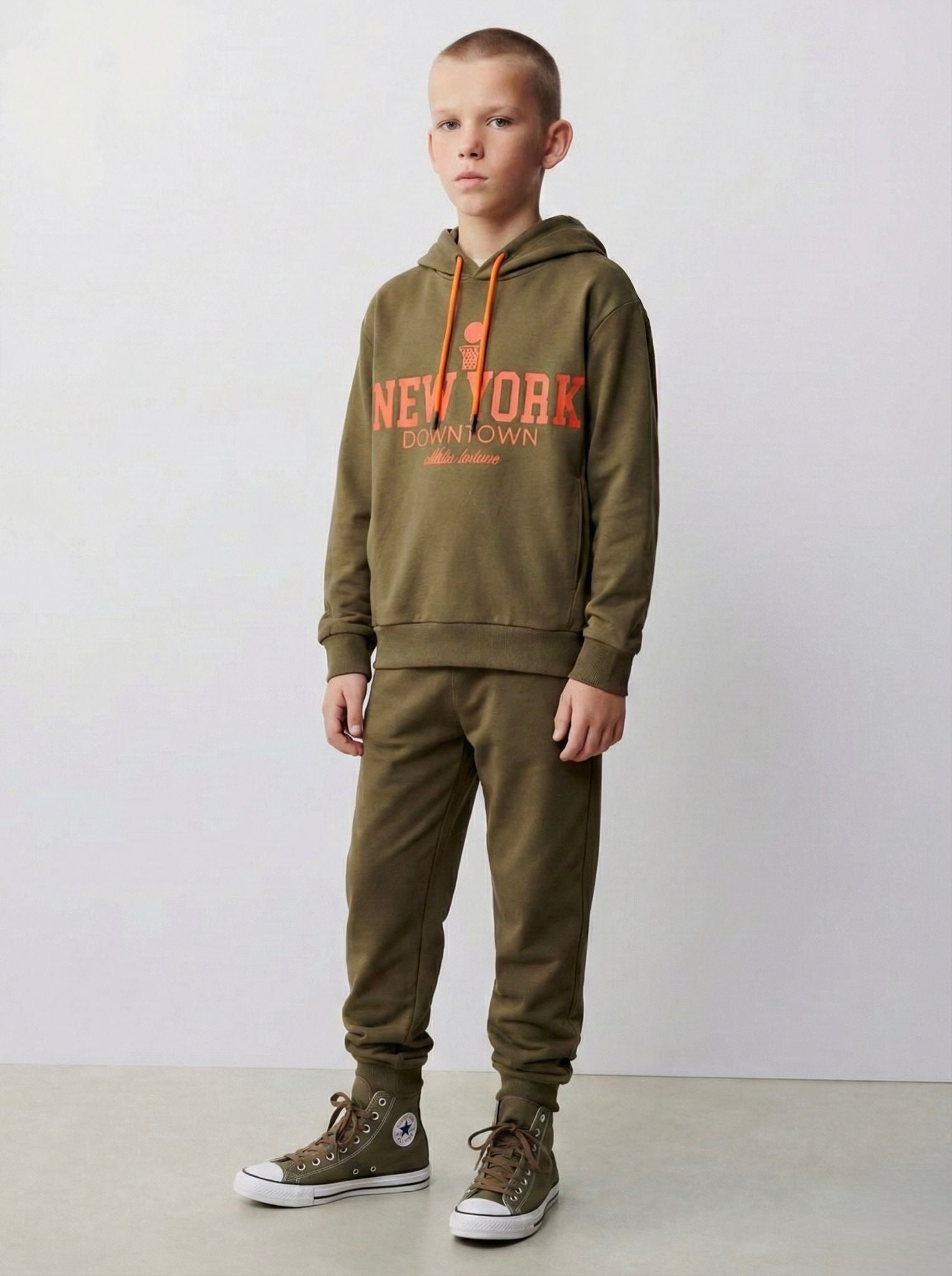 Kapüşonlu sweatshirt formu, modern spor stilini tamamlarken rib detaylı paçalar ve bel kısmı gün boyu düzgün duruş sağlar. Lastikli bel yapısına sahip pantolon, kolay giyilip çıkarma imkânı sunar. Haki ve lacivert renk seçenekleriyle hem sade hem dinamik kombinler oluşturulabilir.