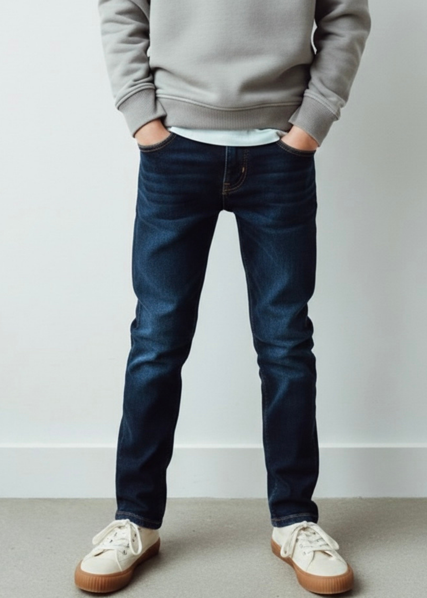 Genç çocuk unisex koyu mavi jean, kız ve erkek çocuk giyim kategorisinde 9–15 yaş aralığı için tasarlanmış, dayanıklı denim kumaşı ve rahat kesimi ile günlük kullanıma uygun bir kot pantolon modelidir. Koyu mavi jean rengi, okuldan şehir yaşamına kadar farklı kombinlerle kolayca uyum sağlar.