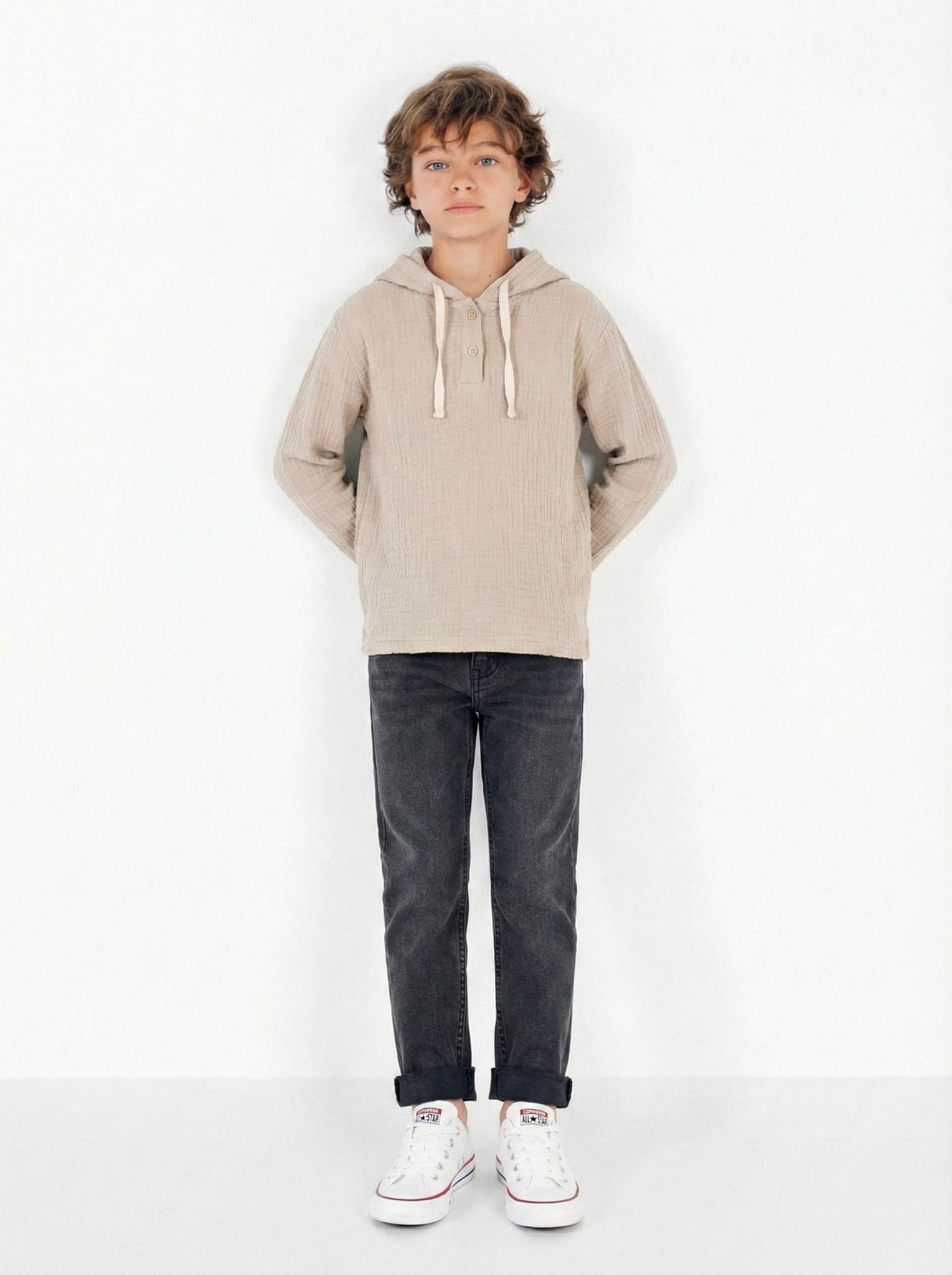 Genç Kız ve Erkek Müslin Kapüşonlu Sweatshirt | Uzun Kollu, Düğmeli