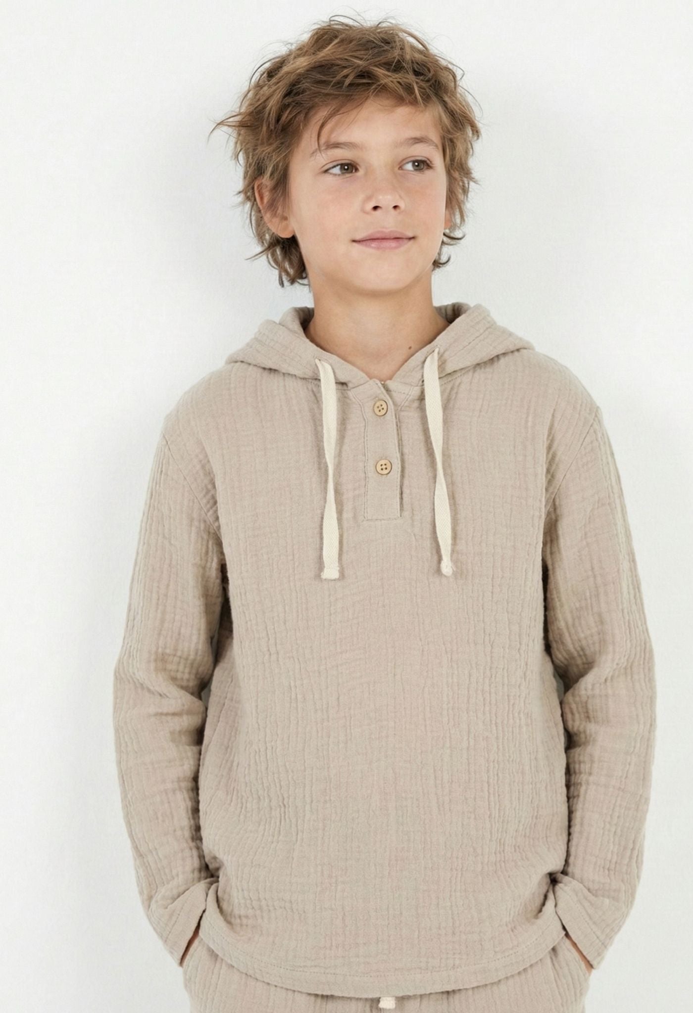 %100 doğal müslin kumaştan üretilen bu genç çocuk sweatshirt modeli, hem erkek hem kız çocuklar için ideal bir seçimdir. Nefes alabilir yapısı sayesinde cilde dosttur ve dört mevsim kullanım için uygundur. Kapüşon detayı, uzun kolları ve doğal düğmeleriyle zamansız bir stil sunar. Günlük giyimde konforu ve şıklığı bir arada isteyen gençler için özel olarak tasarlanmıştır.