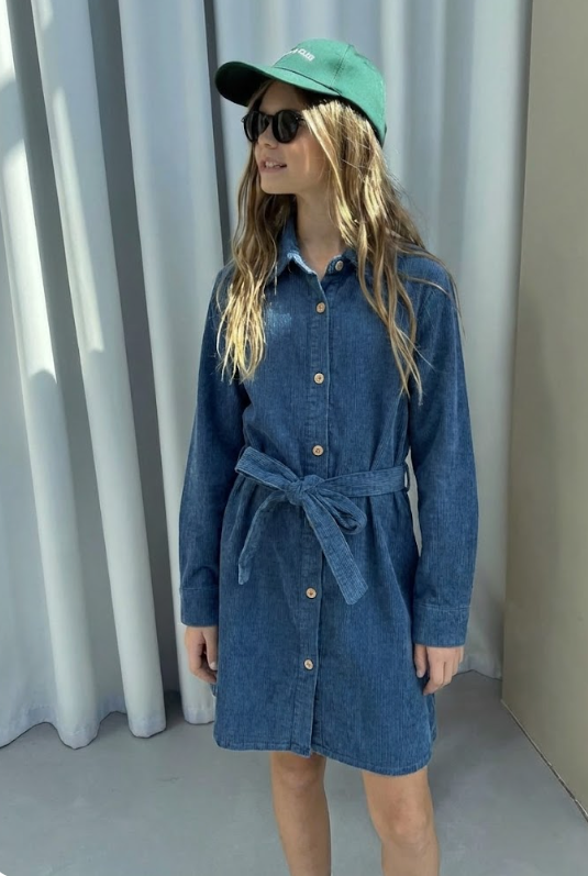 Genç Kot Elbise – Kemerli, Düğmeli, Gömlek Yaka, Uzun Kollu