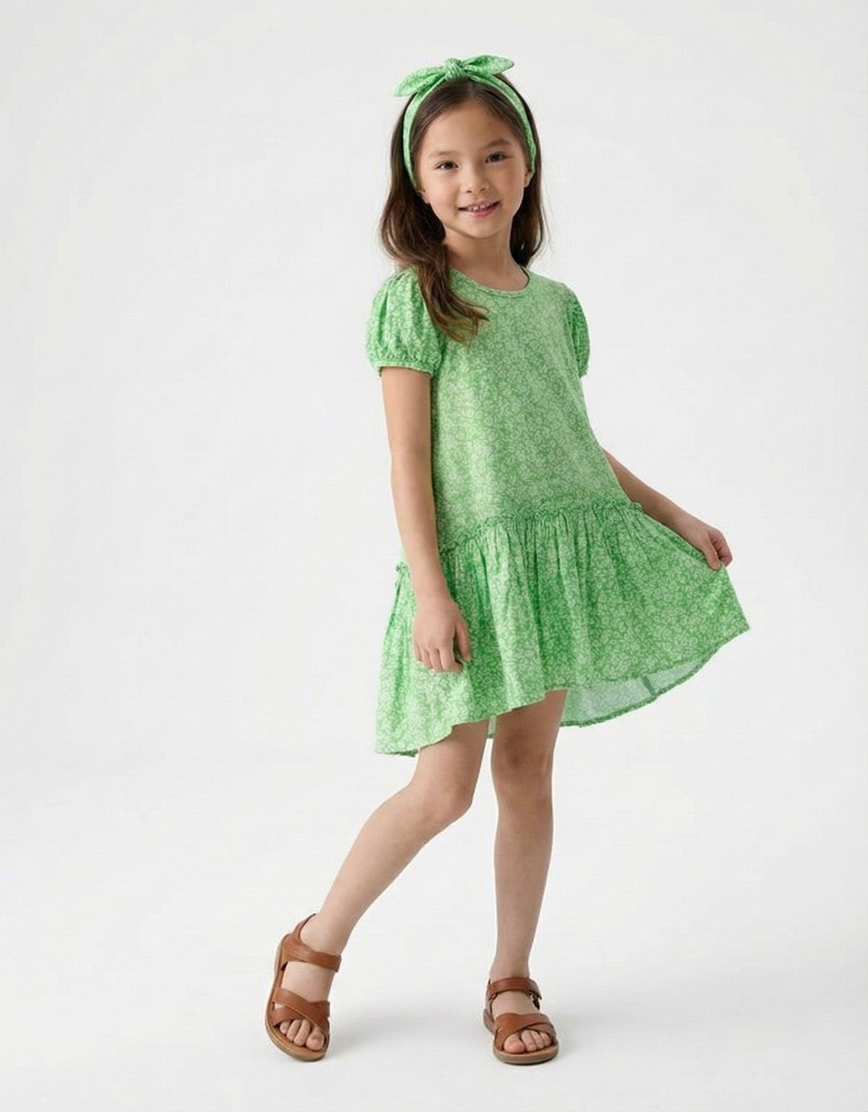 Pamuk çiçek desenli kız çocuk elbisesi ve saç bandı; 3–9 yaş için yumuşak pamuk kumaşıyla nefes alır. Günlük kullanımda konfor sunar. Şimdi sipariş verin!