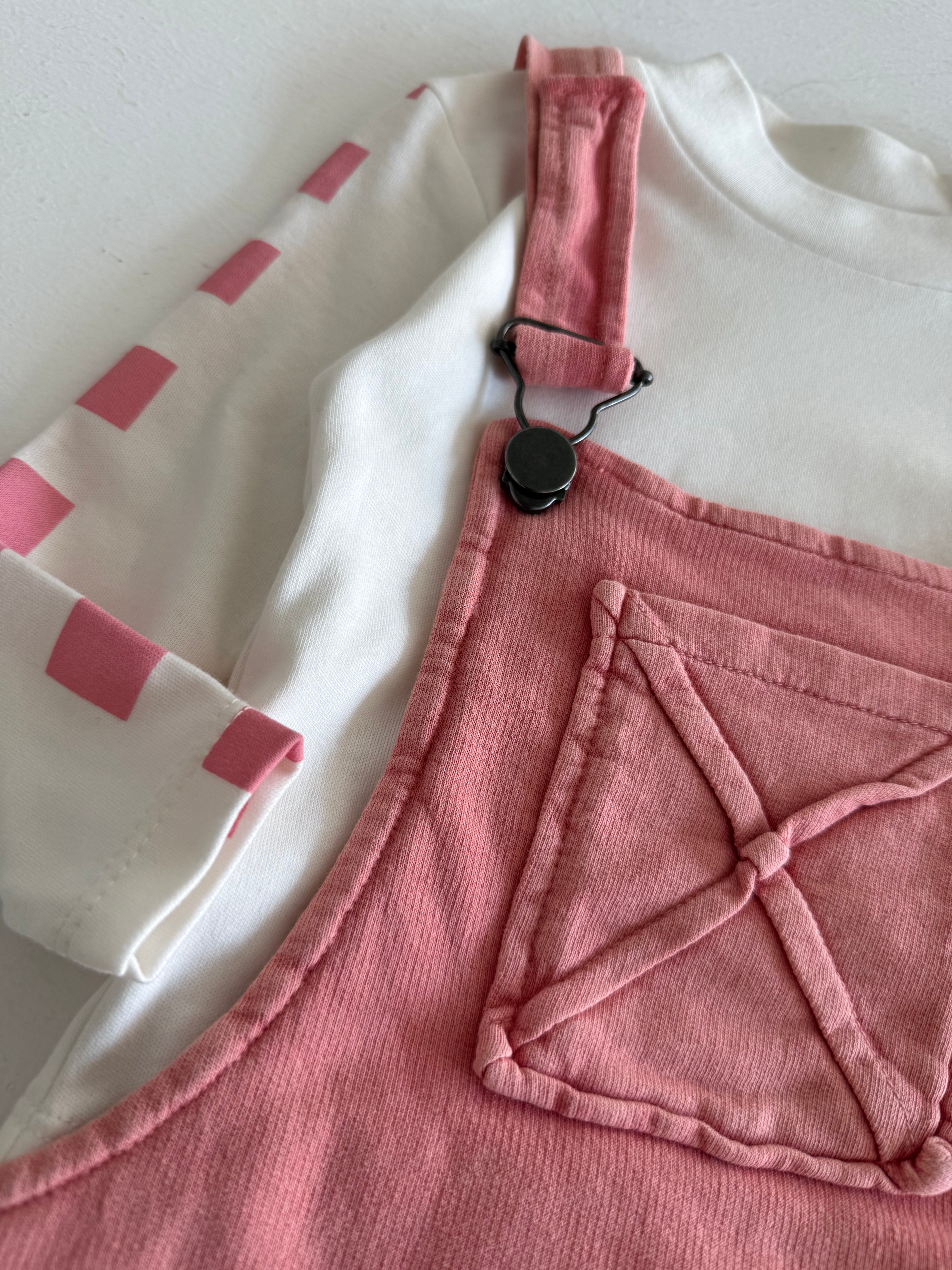 Bu takım, sade ve şık tasarımıyla dikkat çeker. Pudra pembesi tulum ve beyaz tişörtün kombinasyonu, bebeğinize tatlı bir görünüm sağlar. Yıkanmış kot görünümlü kumaş, takıma vintage bir hava katarken, çizgili kol detayı da şıklığı tamamlar. Hem günlük hayatta hem de özel günlerde kullanılabilir.