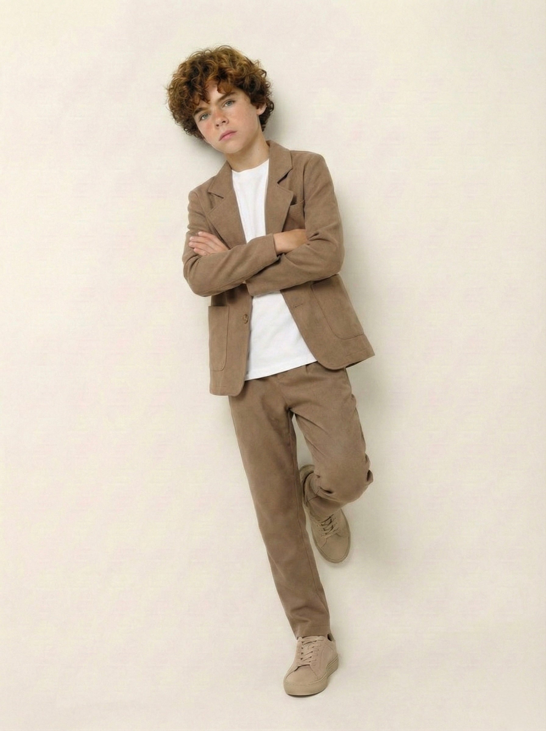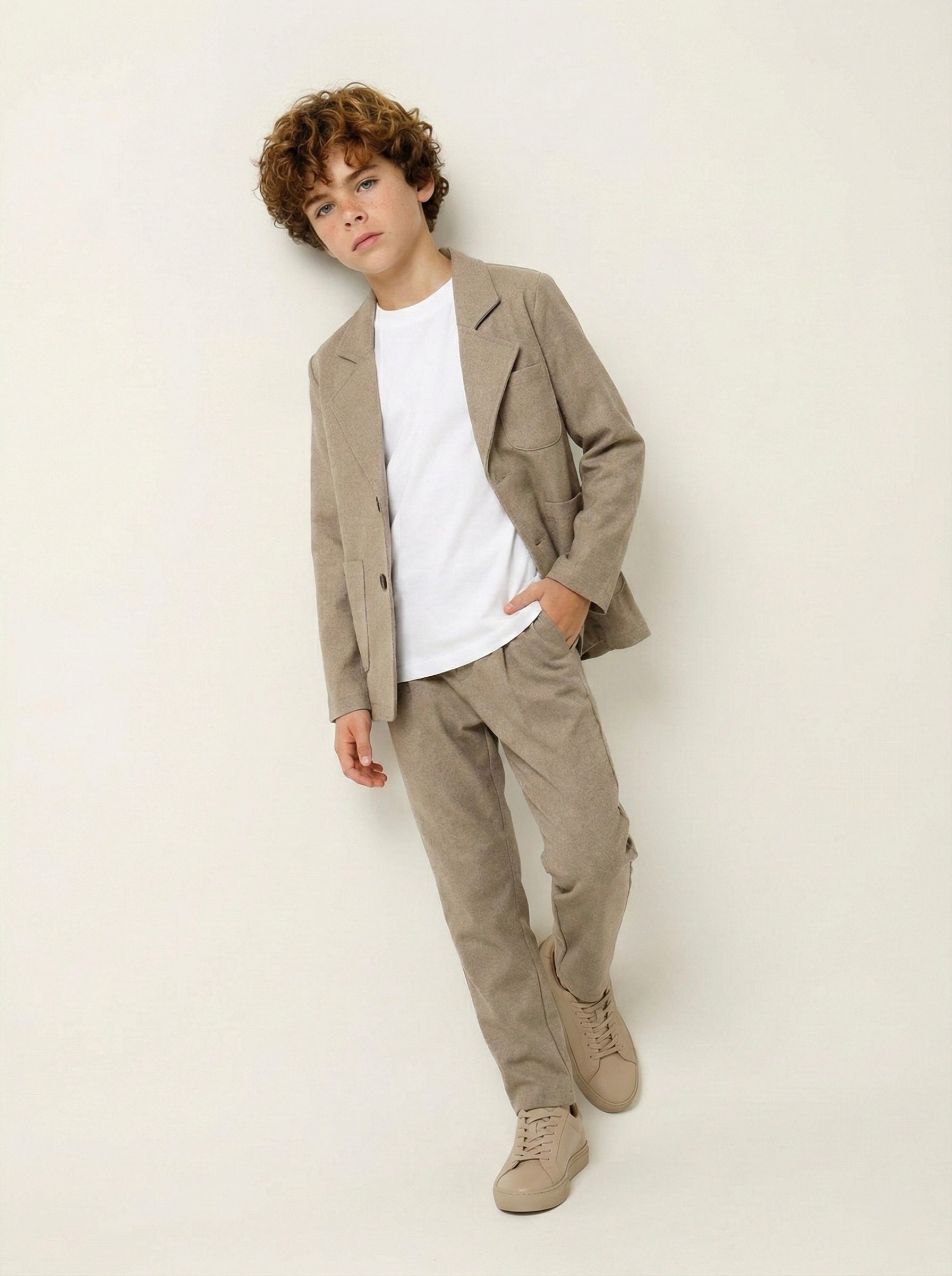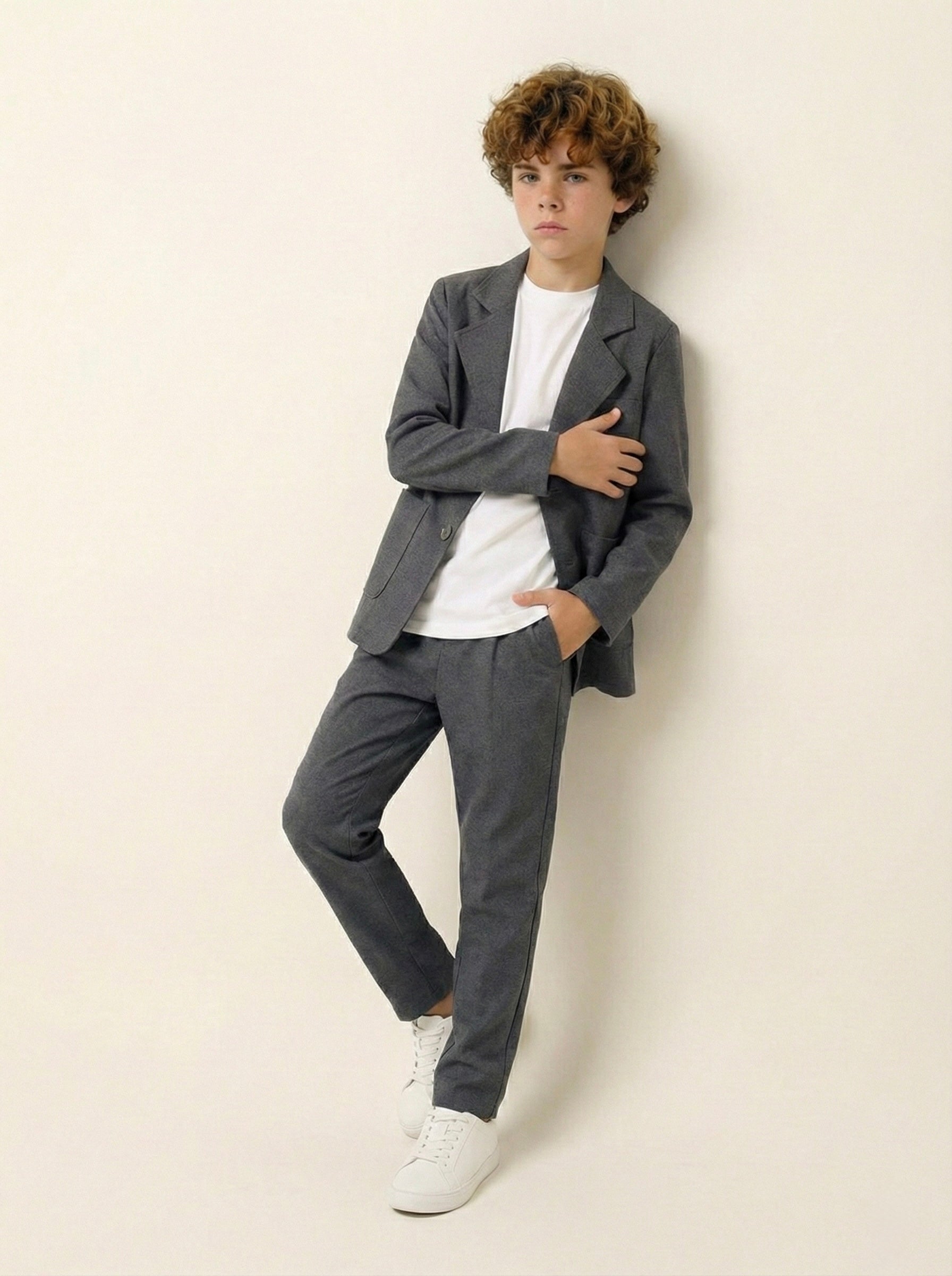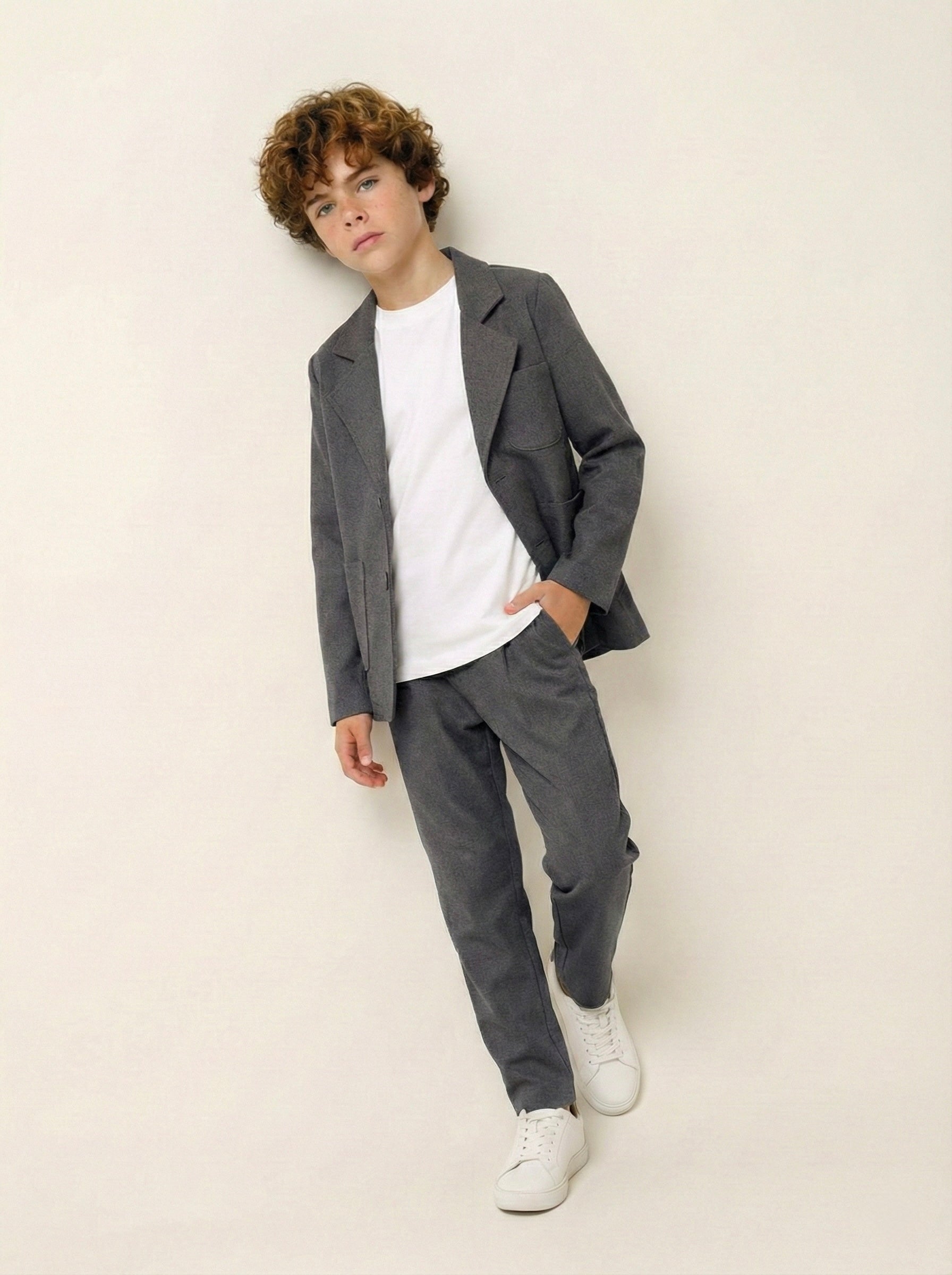 Этот детский костюм-тройка для мальчиков от 3 до 9 лет включает в себя пиджак, футболку и брюки. Изготовленный из вискозно-хлопковой ткани, он сочетает в себе стиль и комфорт для особых случаев. Закажите прямо сейчас!