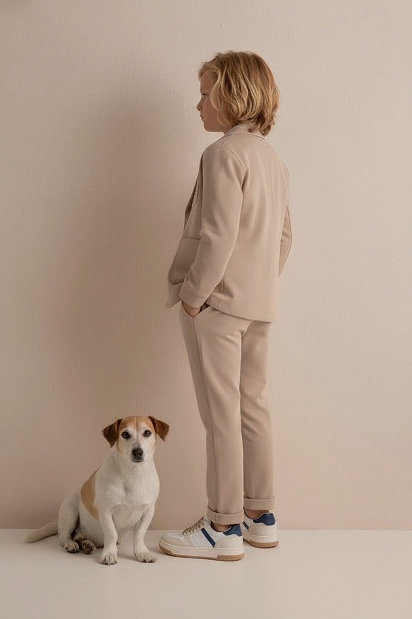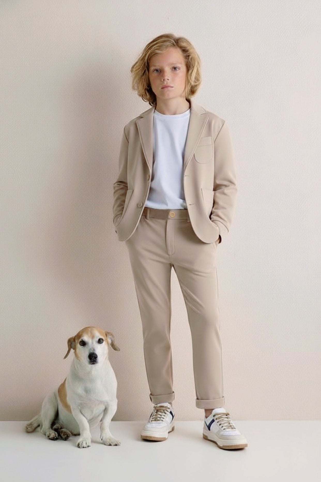 Этот бежевый костюм, который добавит нотку современной мальчишеской одежды в гардероб вашего ребенка, привлекает внимание высококачественной тканью и тщательно продуманными деталями.