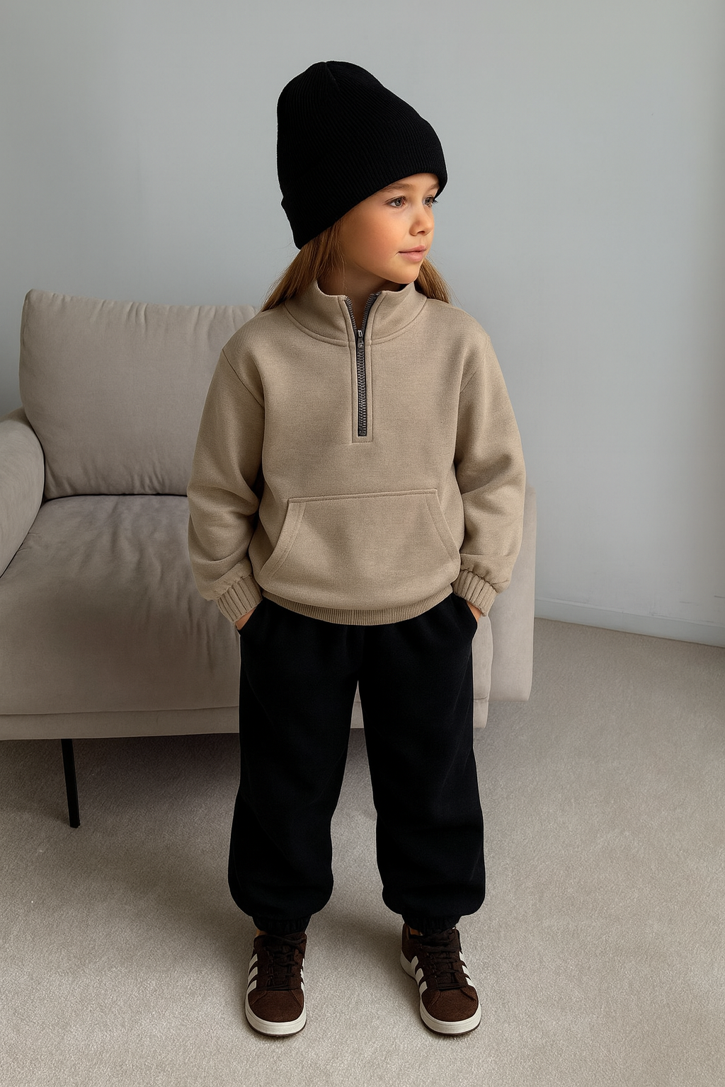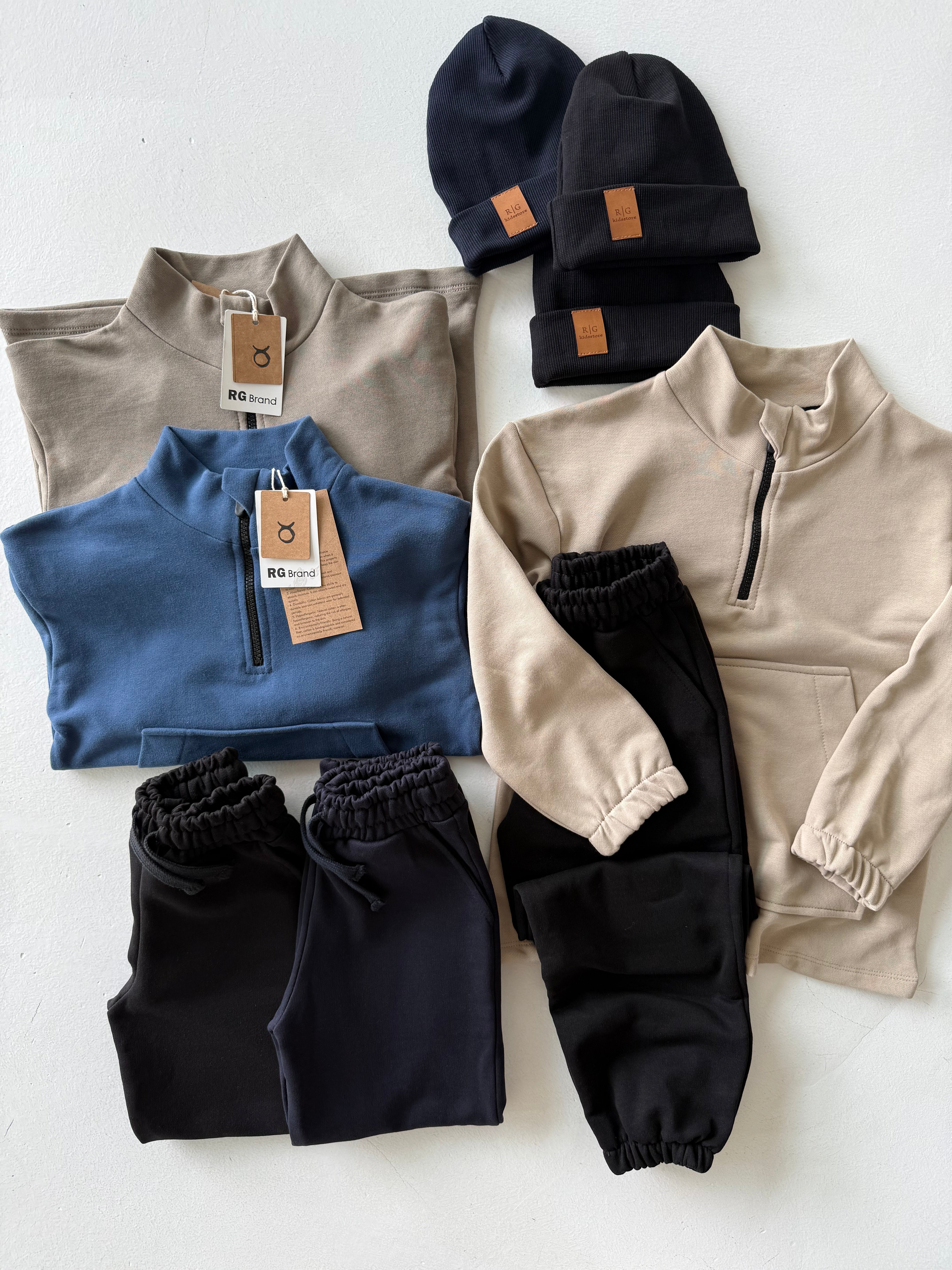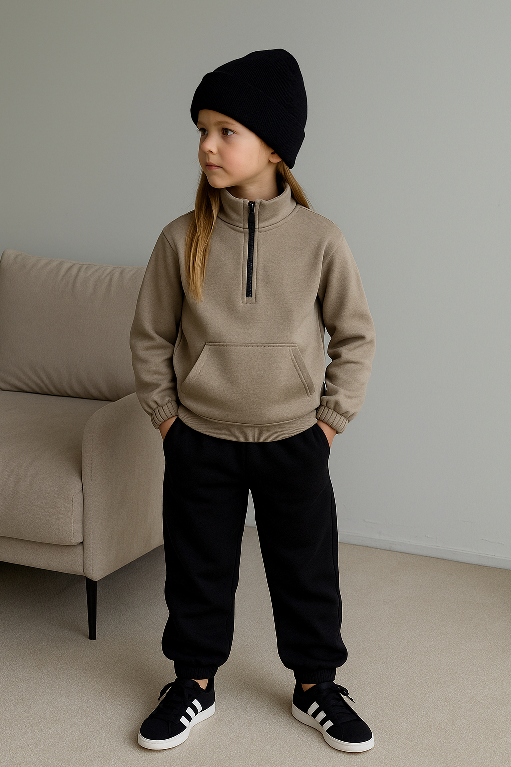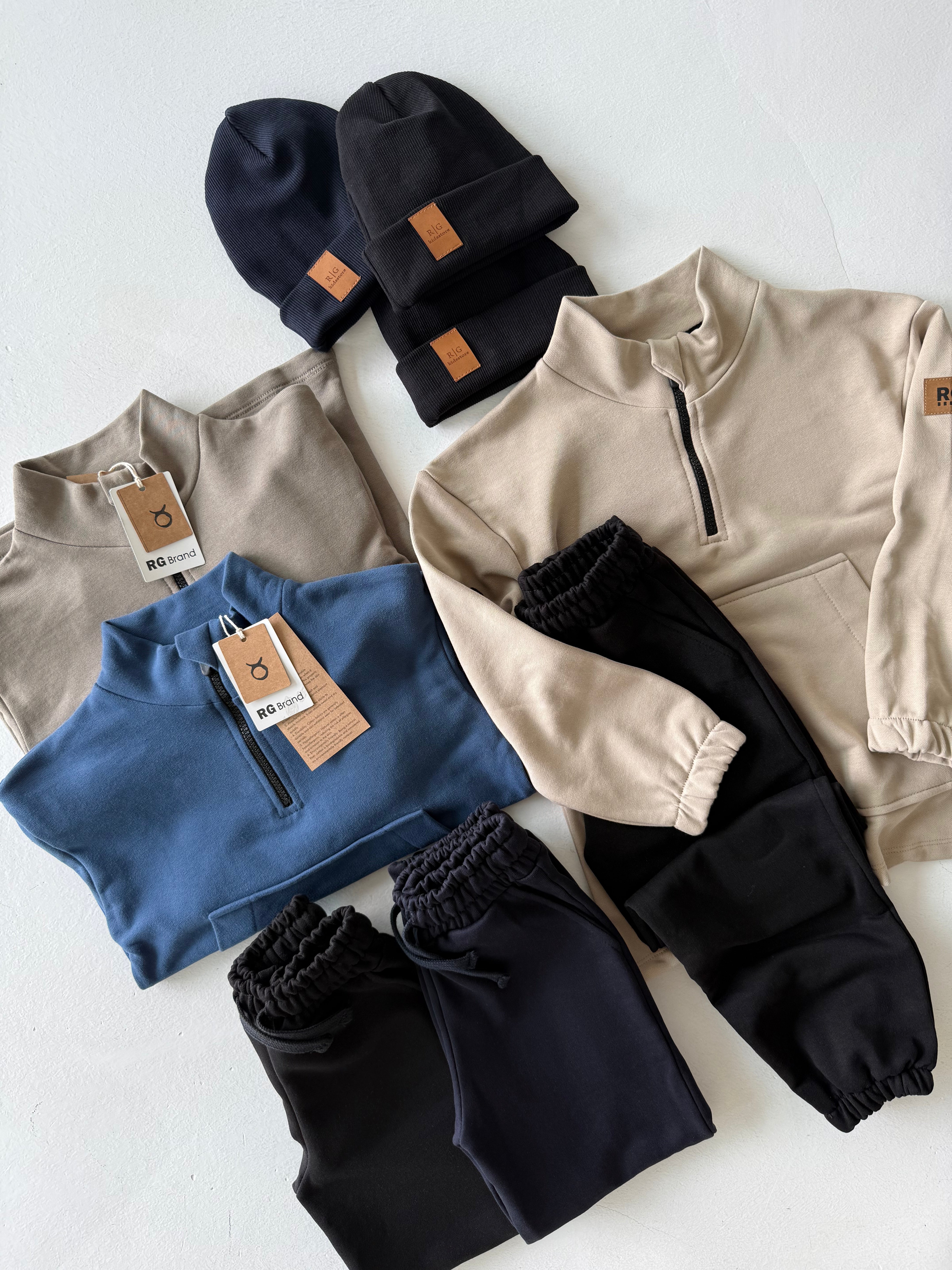 Комплект из трёх предметов, сочетающий в себе повседневный комфорт и лаконичную элегантность: спортивные брюки с карманом-кенгуру на молнии до середины бедра, джоггеры с эластичным поясом и подходящая к ним шапка. Трёхнитный материал без ворса обеспечивает воздухопроницаемость, сохраняет тепло, не вызывая потоотделения, и подходит для ношения в любое время года.