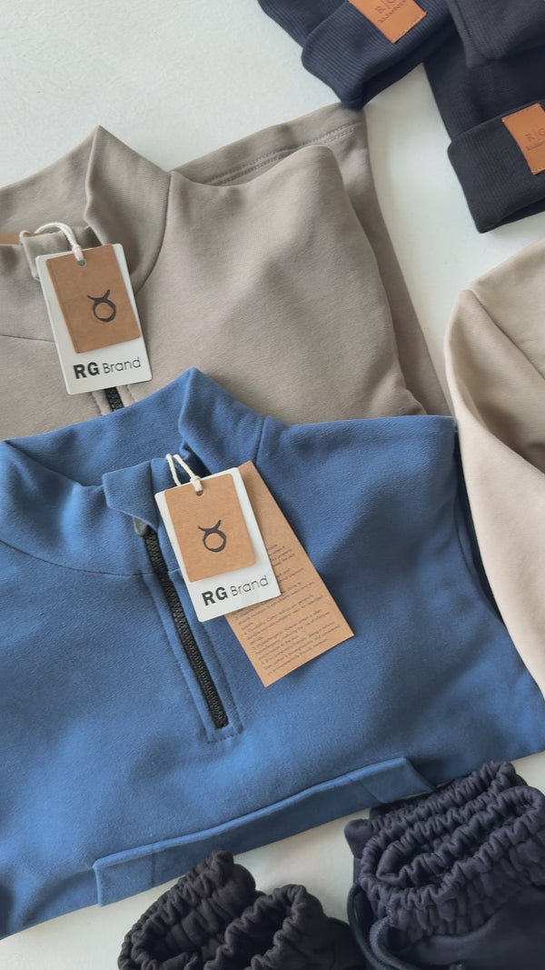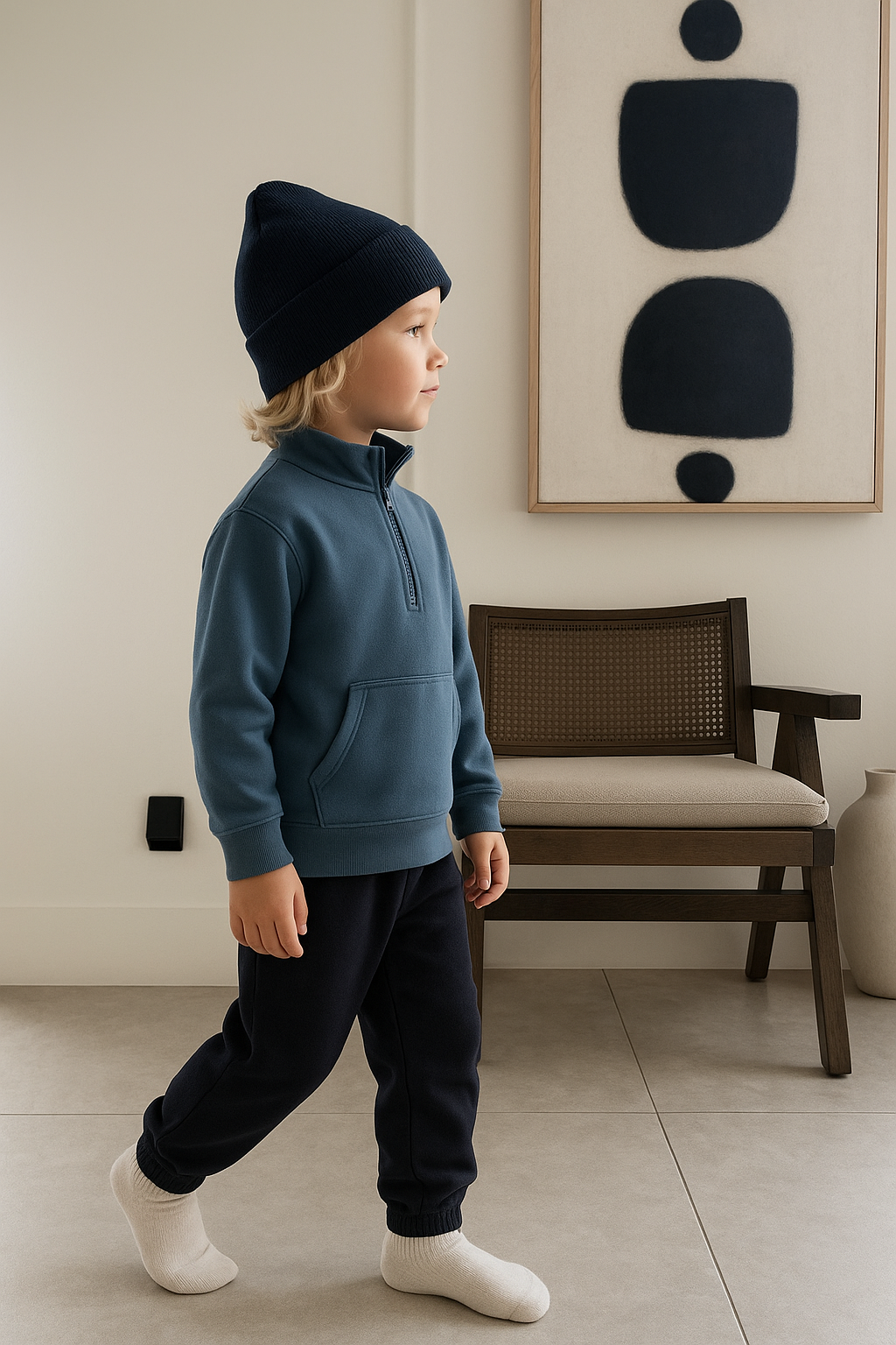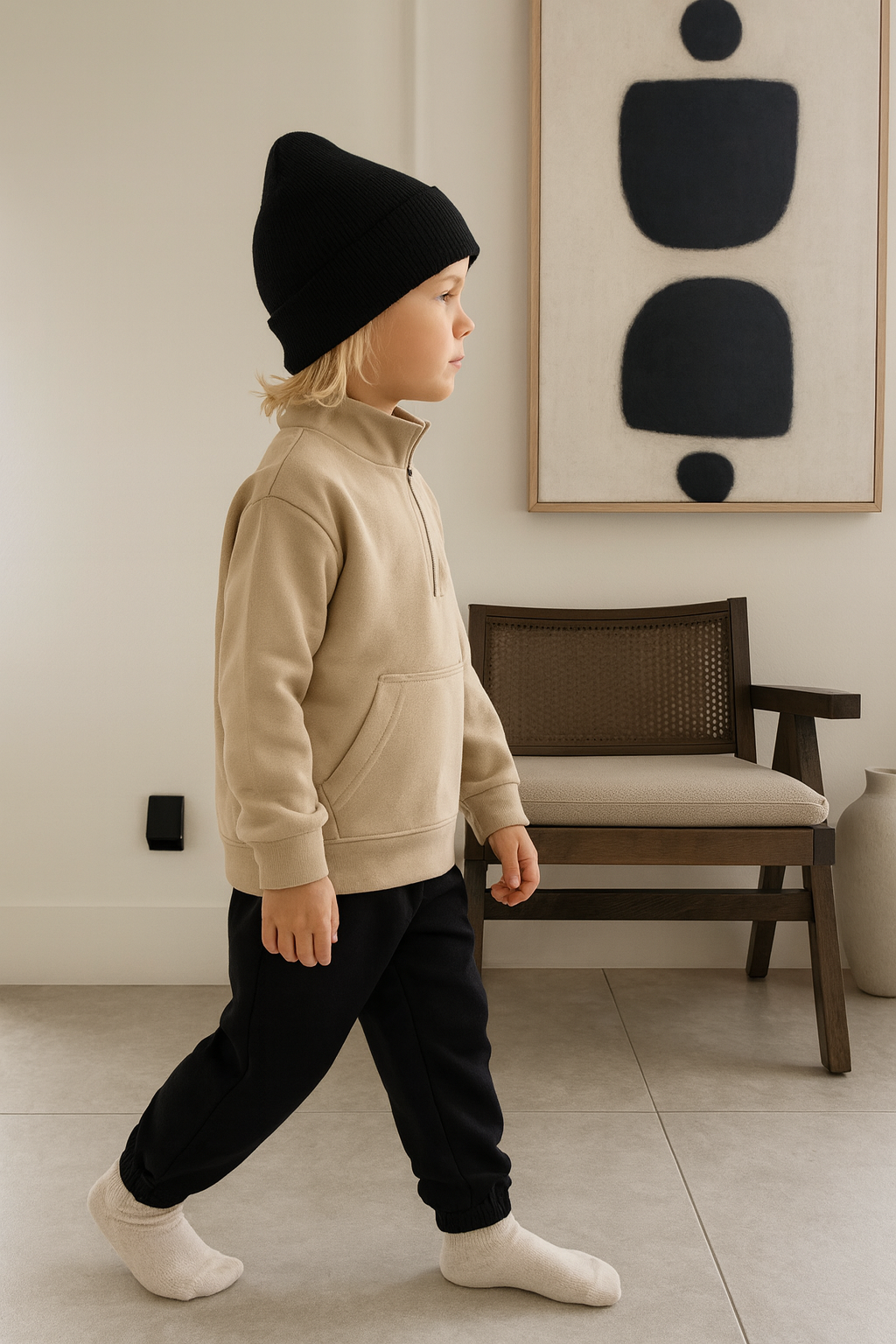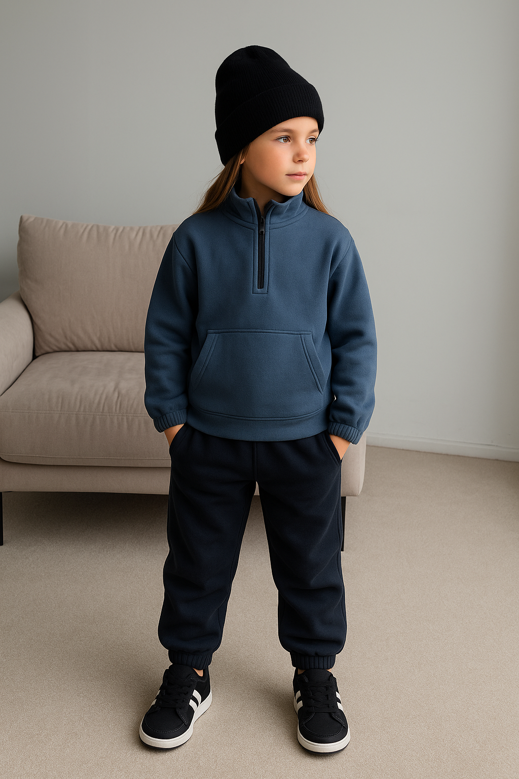Комплект из трёх предметов, сочетающий в себе повседневный комфорт и лаконичную элегантность: спортивные брюки с карманом-кенгуру на молнии до середины бедра, джоггеры с эластичным поясом и подходящая к ним шапка. Трёхнитный материал без ворса обеспечивает воздухопроницаемость, сохраняет тепло, не вызывая потоотделения, и подходит для ношения в любое время года.