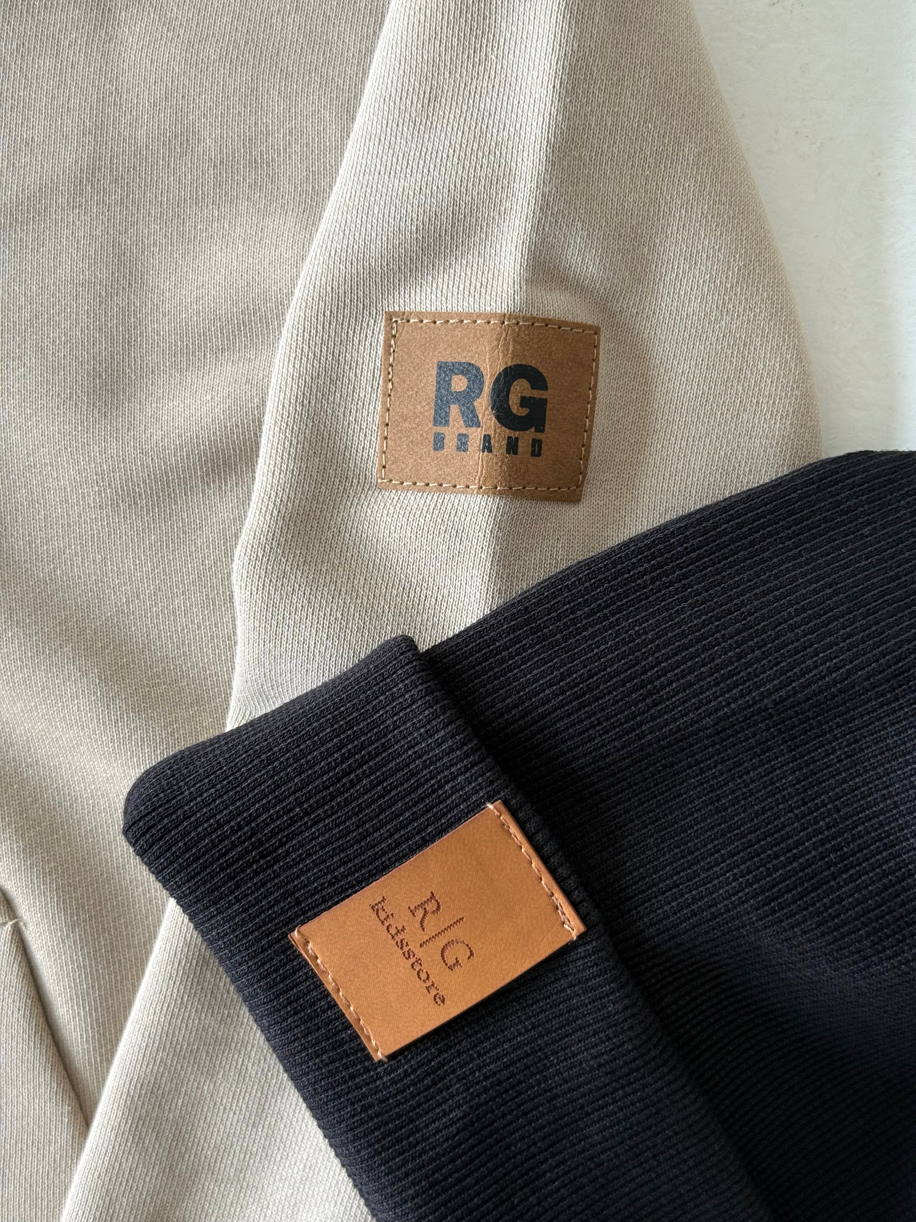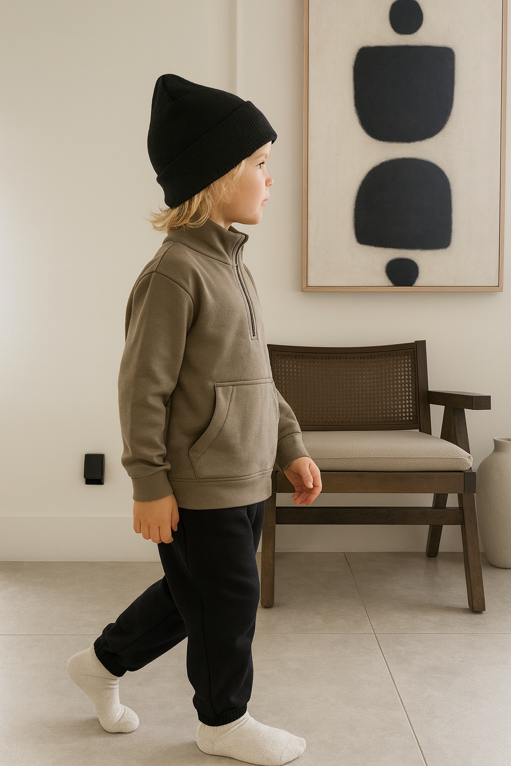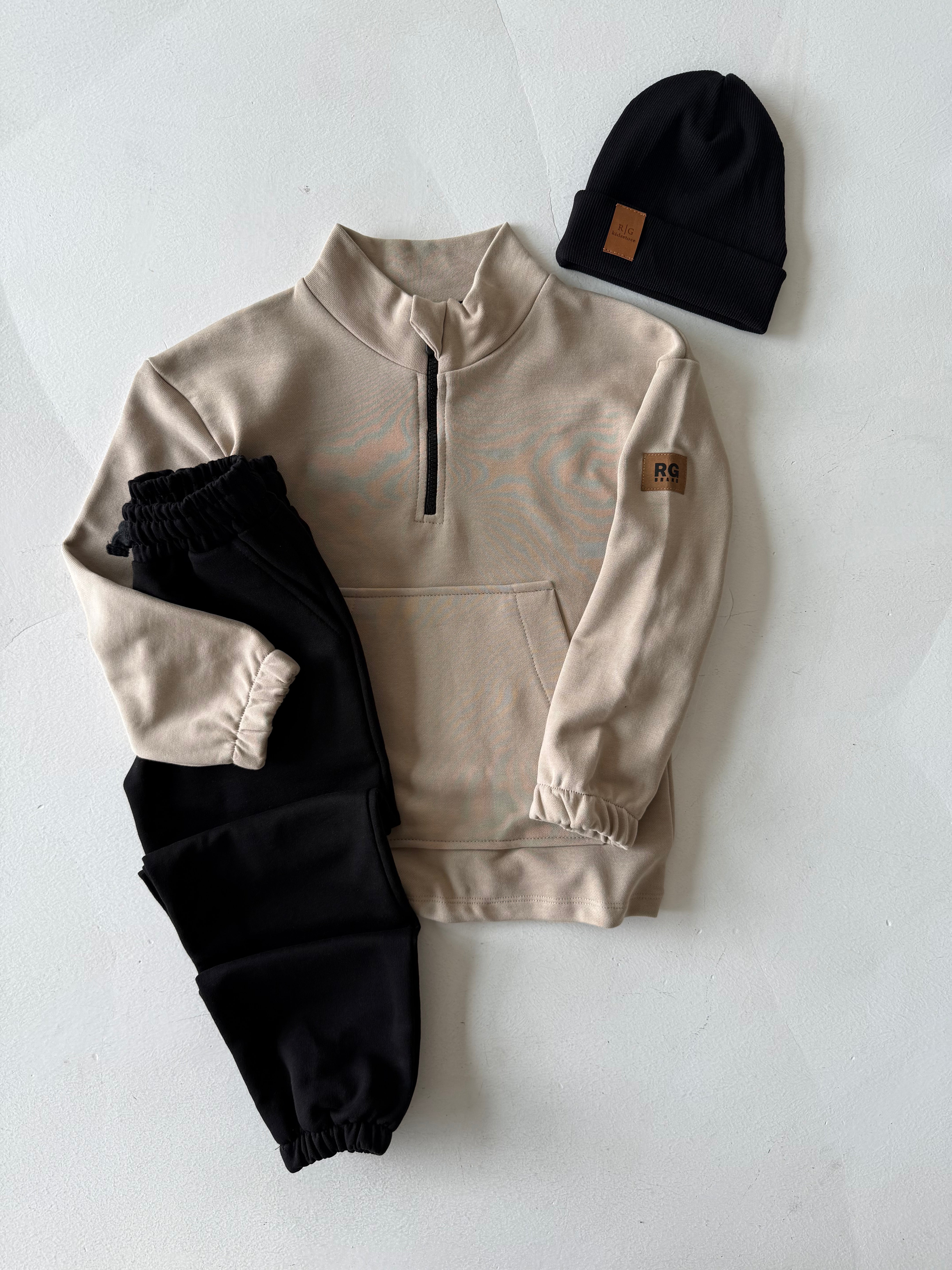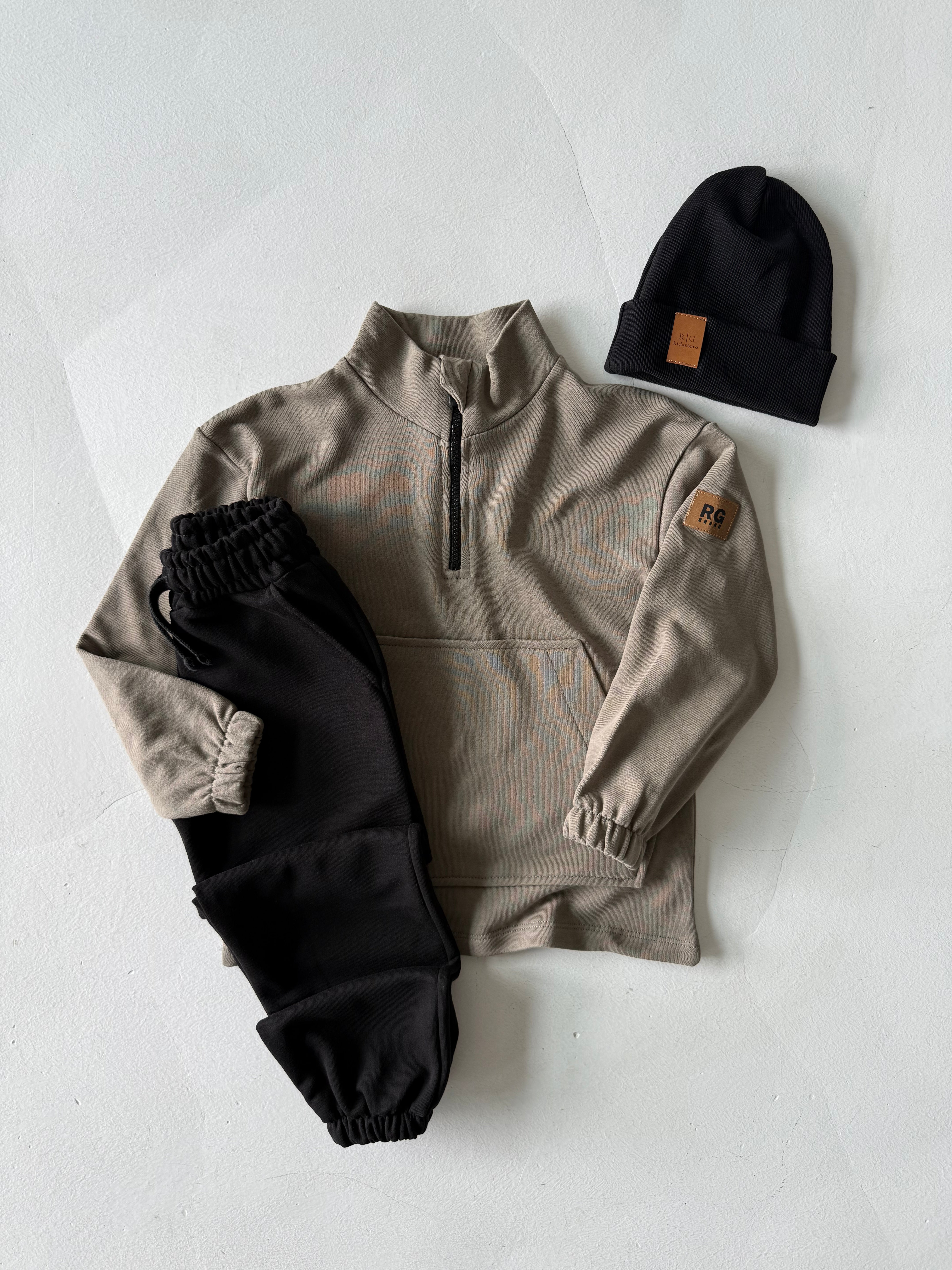 Сочетание цветов (на изображении): толстовка цвета камня + черные брюки-джоггеры + черная шапочка.